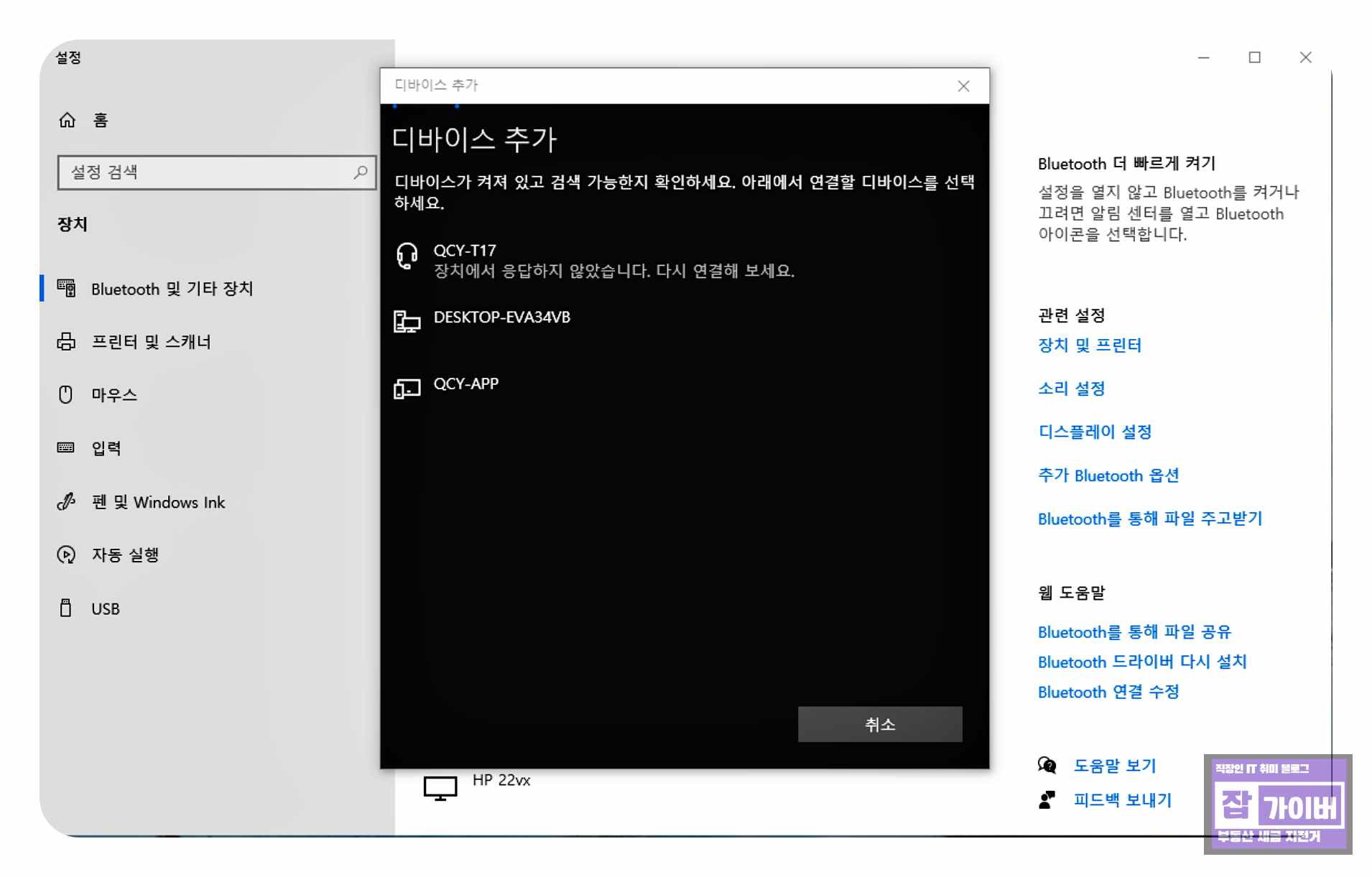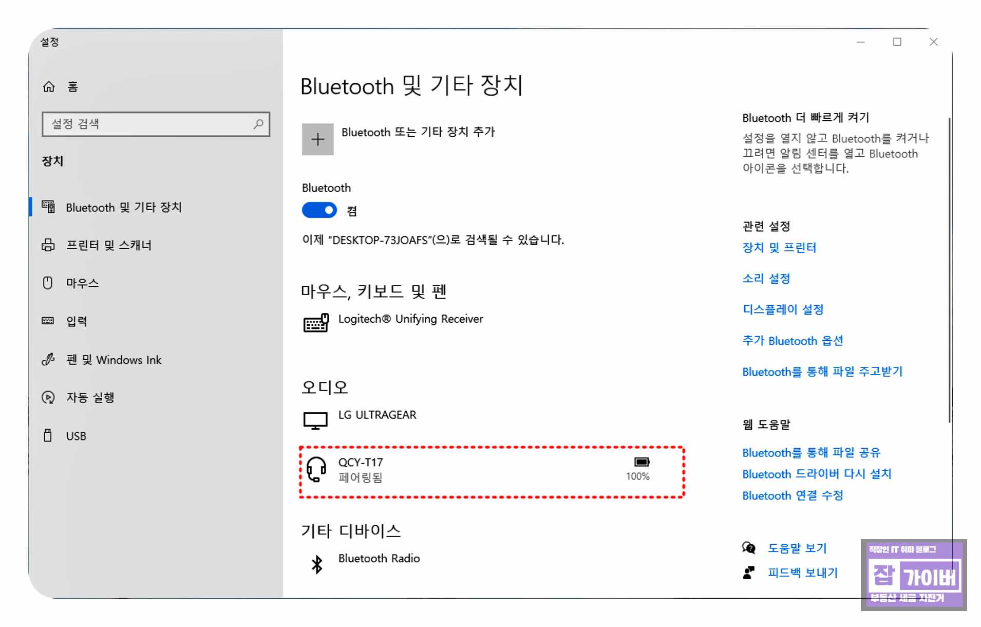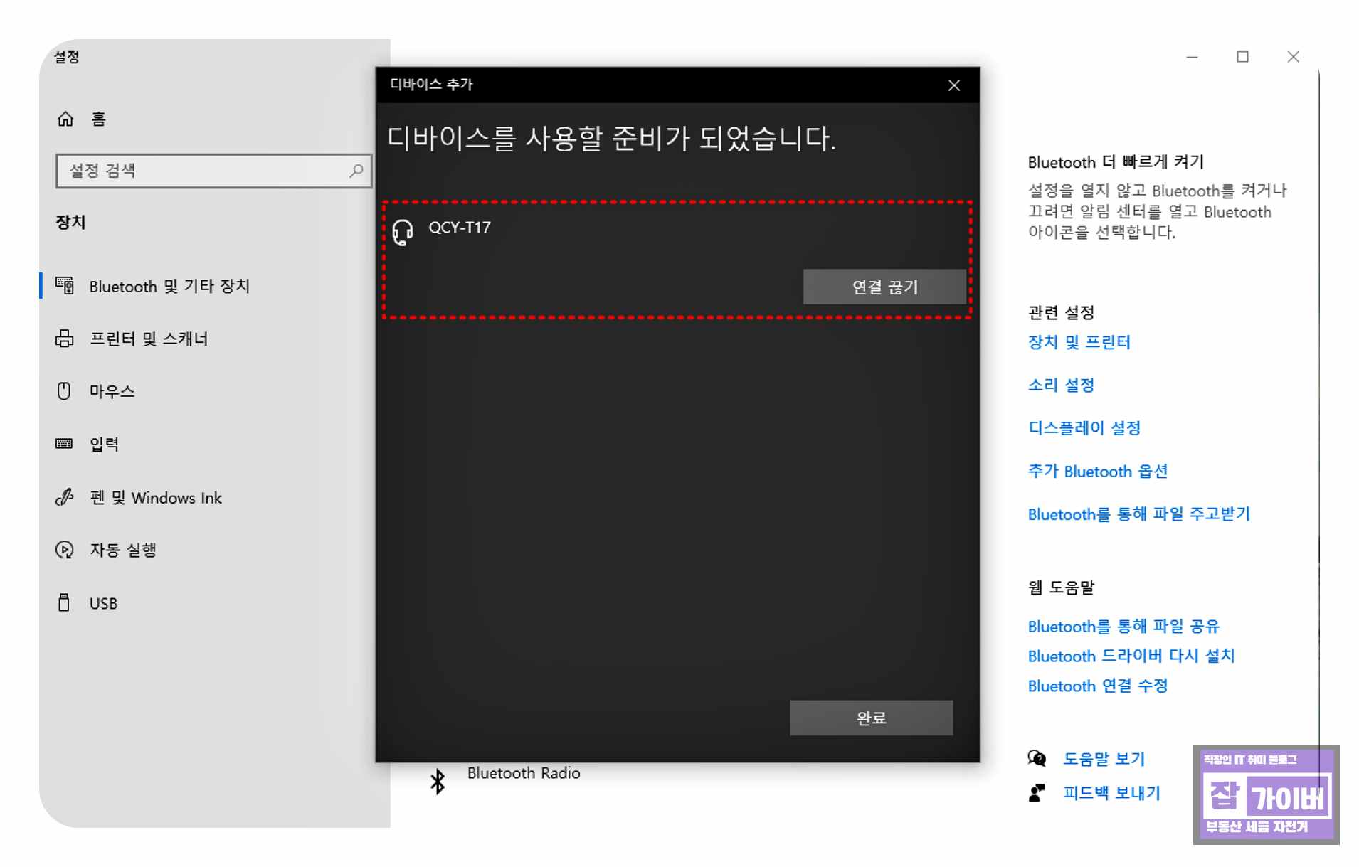 일단, 윈도우10 기준으로 BlueTooth 및 기타 디바이스 설정에 들어가 연결된 상태의 QCY-T17 블루투스 이어폰을 확인했습니다. 그러나 소리가 나오지 않아 페어링을 해제하고 다시 연결해 보았습니다.