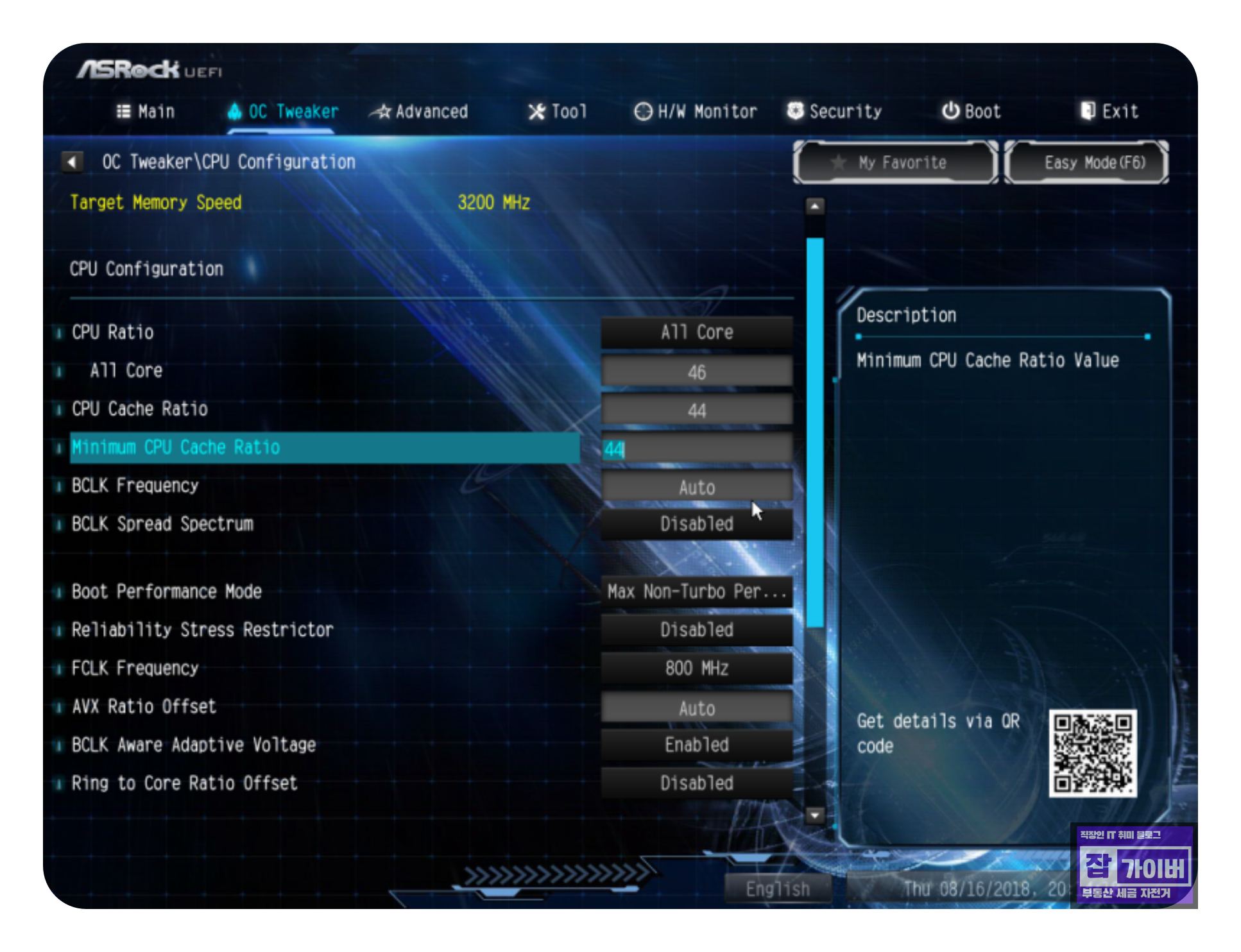 - Minimum CPU Cache Ratio를 설정 (안정화를 위해 Core 배수보다 약간 낮게) 설정하느게 좋으며 그외에도 다양한 설정 (Boot Performance Mode, Reliability Stress Restrictor 등)을 안정적인 상태로 조절 합니다.