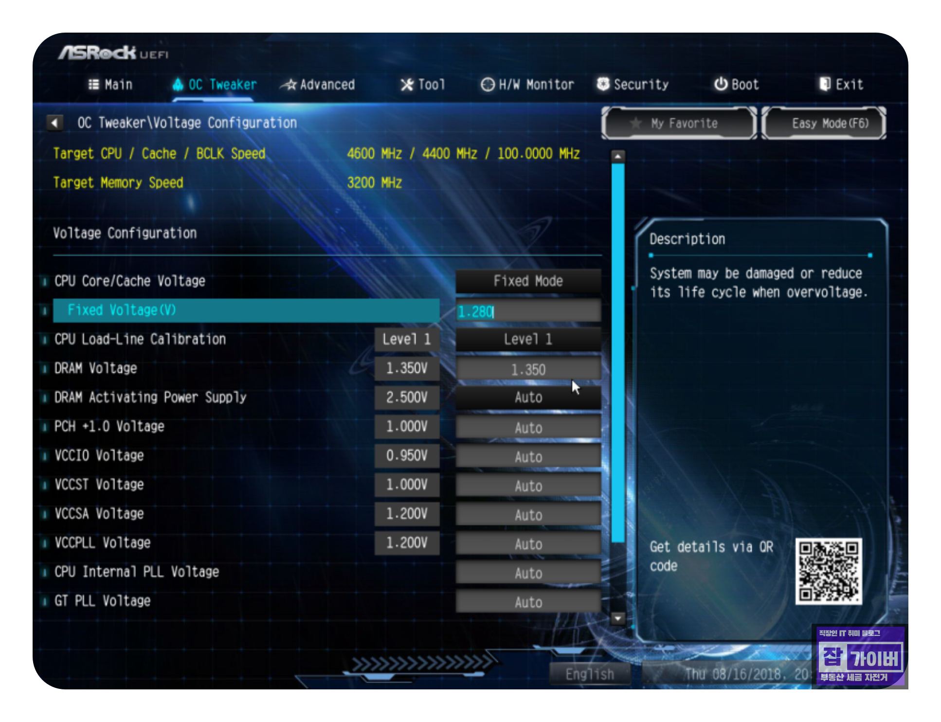 - 'OC Tweaker/Voltage Configuration'에서 CPU Core/Cache Voltage를 'Fixed Mode'로 설정하고 목표 전압으로 조절