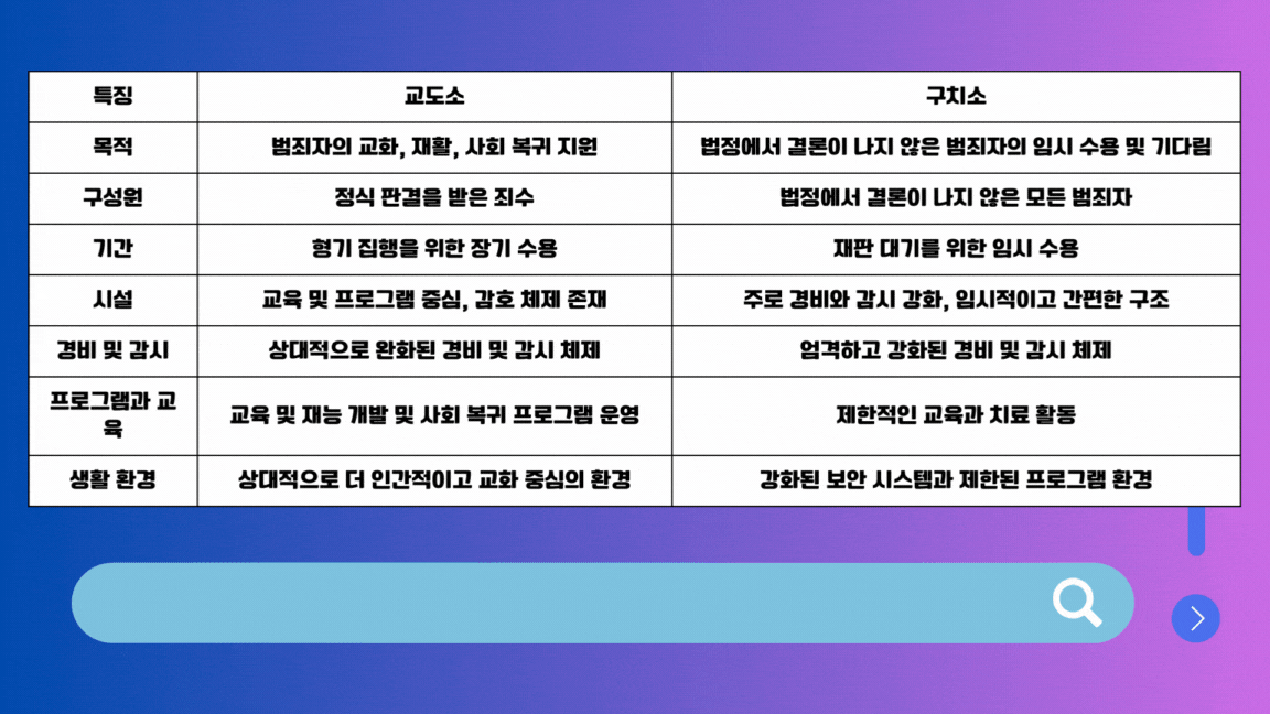 | 목적 | 교화, 재활, 사회 복귀 지원 | 법정 대기를 위한 임시 수용 및 안전 보장 |