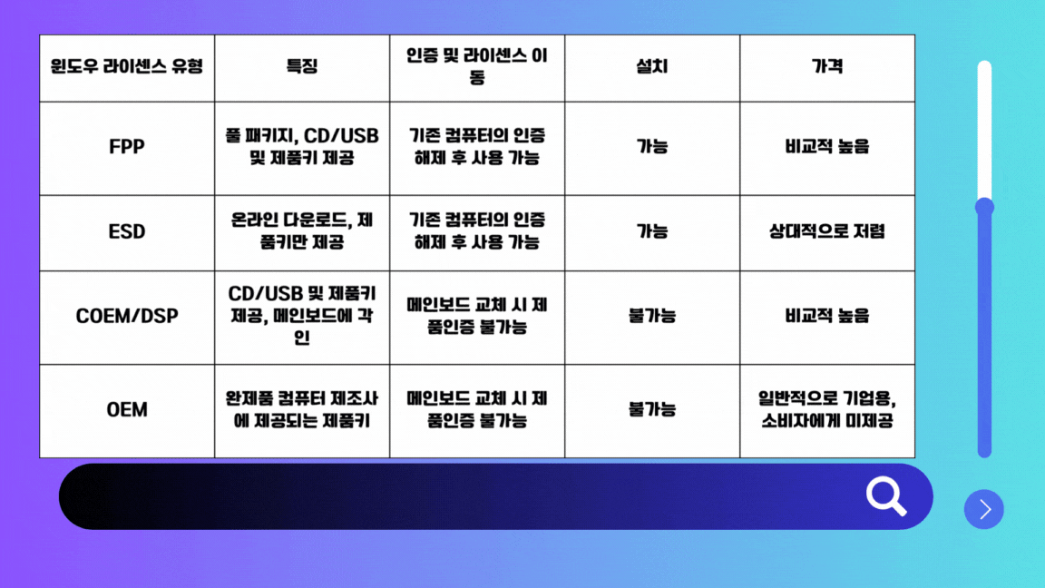 이러한 라이센스들은 각각의 특징을 가지고 있으며, 사용자는 구입 시 이러한 차이를 이해하는 것이 중요합니다. 풀패키지로 출시되어 영구적으로 사용 가능한 FPP부터, 온라인으로 다운로드 받아 설치하는 편리한 ESD까지 다양한 옵션이 존재합니다. 메인보드 교체와 관련된 COEM과 OEM은 주로 기업이나 대량 사용자를 대상으로 하며, 이에 대한 자세한 내용을 알아보도록 하겠습니다.