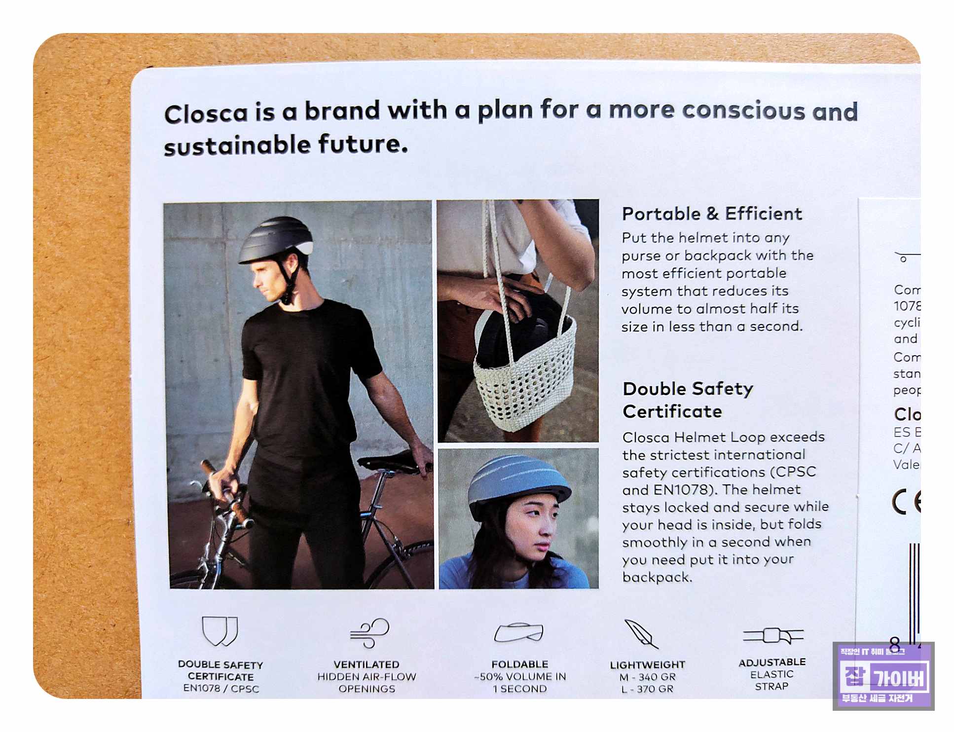 헬멧을 언박싱하면 제품의 특징이 가볍게 표현되어 있습니다. 보호, 통풍(환기), 작은 부피(접이식), 가벼움이 이 제품의 주요 특징으로 꼽힙니다. 특히, 헬멧 내부에는 효과적인 통풍을 제공하는 구멍이 세밀하게 디자인되어 있어 라이딩 중에도 시원함을 느낄 수 있습니다.