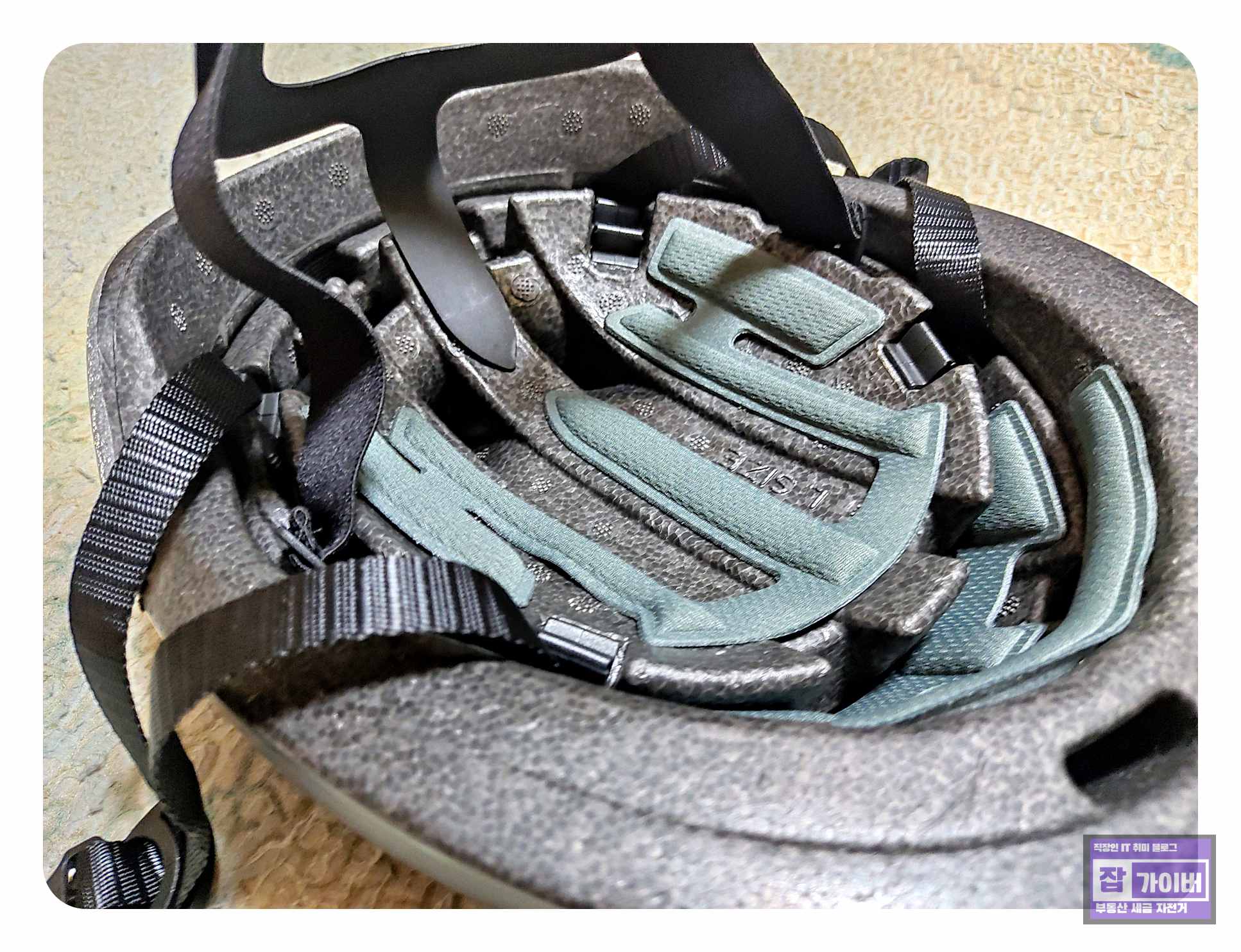 헬멧을 언박싱하면 제품의 특징이 가볍게 표현되어 있습니다. 보호, 통풍(환기), 작은 부피(접이식), 가벼움이 이 제품의 주요 특징으로 꼽힙니다. 특히, 헬멧 내부에는 효과적인 통풍을 제공하는 구멍이 세밀하게 디자인되어 있어 라이딩 중에도 시원함을 느낄 수 있습니다.