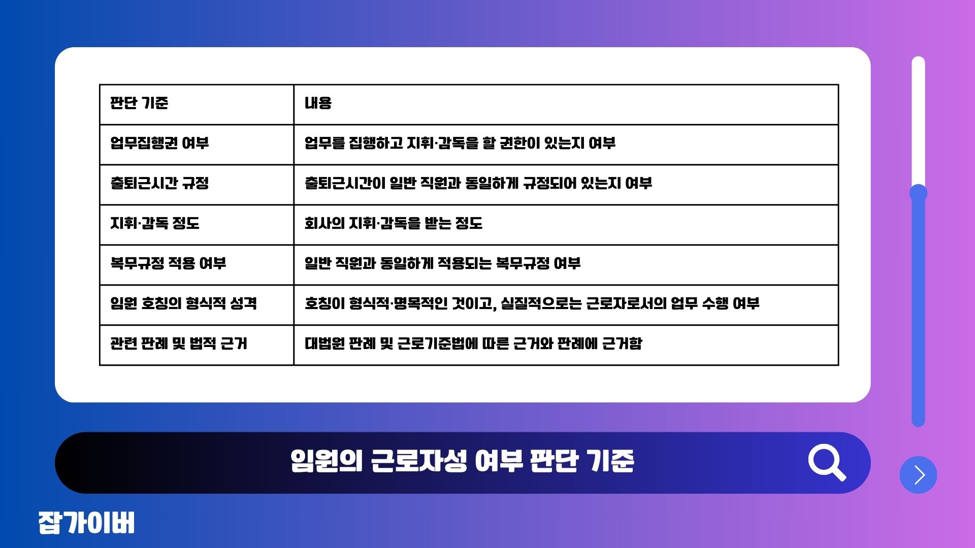 임원 호칭이 부여된다고 해도 해당 임원이 근로자인지 확인하려면 종합적인 판단이 필요합니다. 이를 위해 인사팀은 업무집행권 여부, 출퇴근시간의 규정, 지휘·감독 수준, 복무규정 등을 명확히 설명하여 임원과의 오해를 방지해야 합니다.