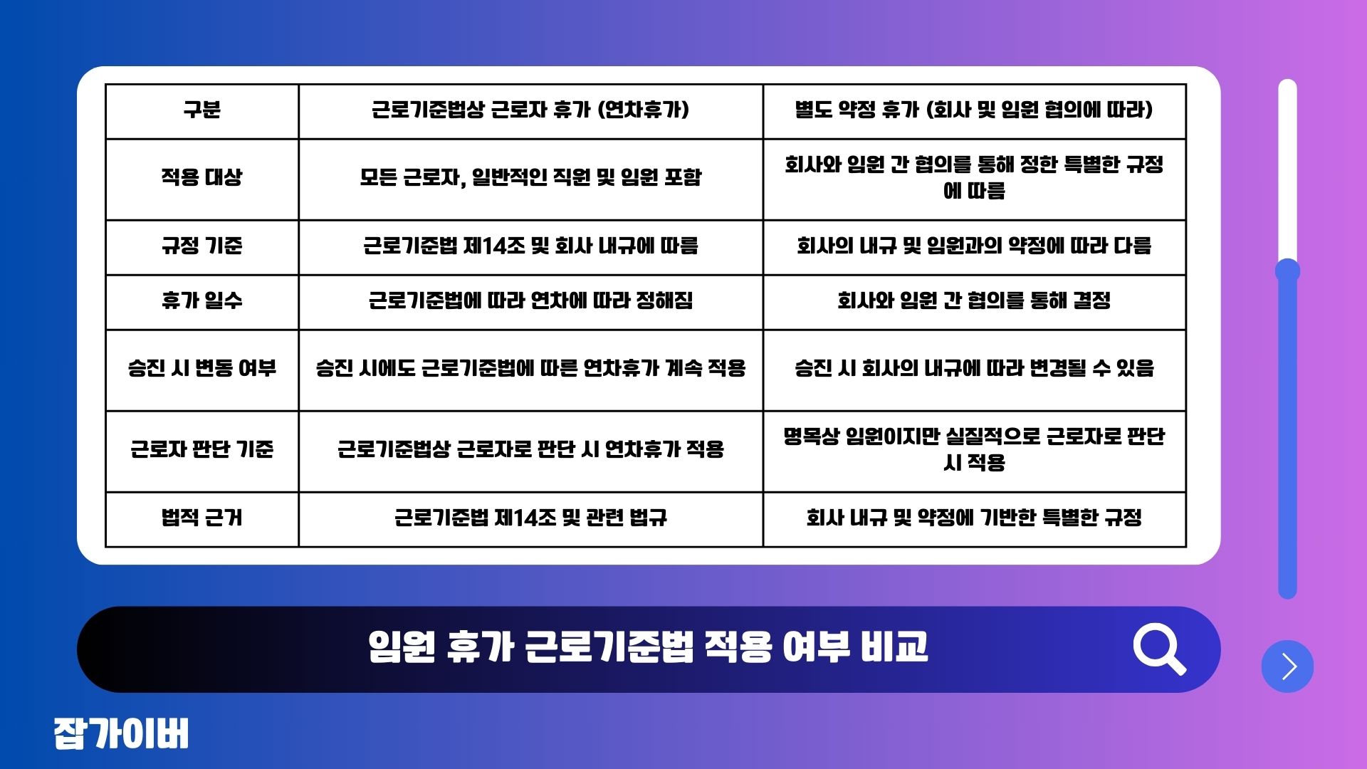 추가로, 근로기준법상 연차휴가를 부여받을 수 있는 근로자에 해당하지 않는 경우에도 회사와 임원 간의 휴가 규정에 따라 유연하게 휴가를 조정할 수 있습니다. 이로써 회사와 임원 간에 원활한 소통과 업무 진행이 이루어질 수 있도록 주의가 필요합니다.