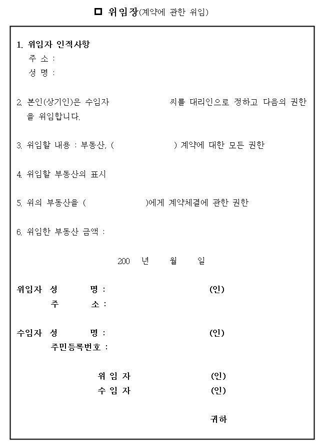 - 특정 부동산에 대한 권한 일정 부분을 위임하는 양식으로, 위임자의 인감도장과 인감증명서 등을 첨부하여 상대방과 합의된 경우에 유효합니다.