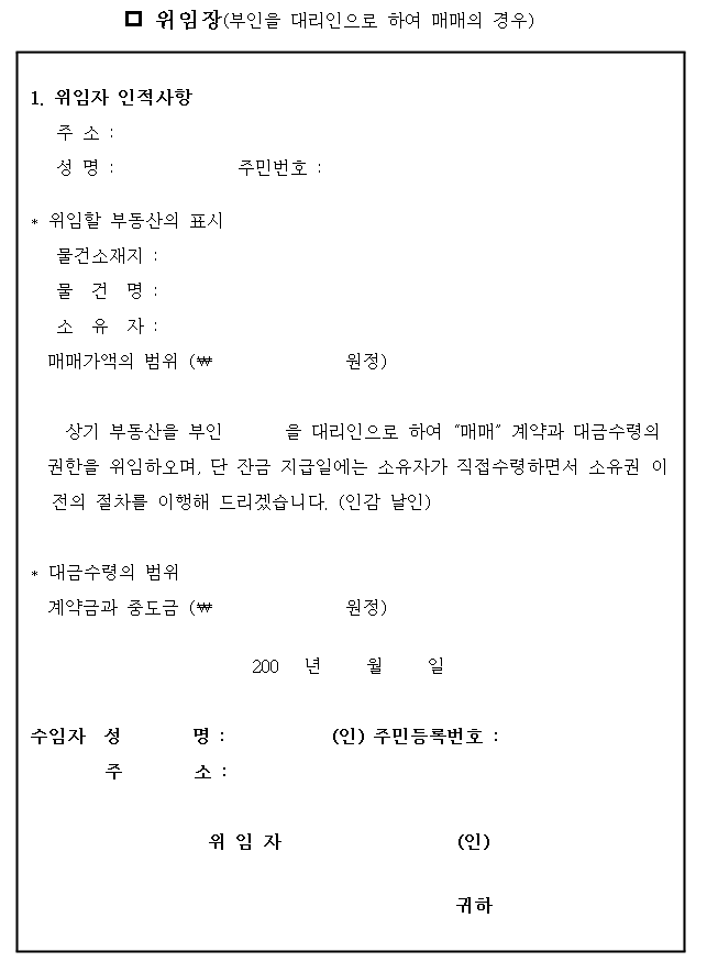 - 부인이 부동산 거래를 위해 남편에게 위임을 받을 때 위임장 작성이 필요하며, 계약 이후에도 위임장에 도장을 받아오는 것이 좋습니다.