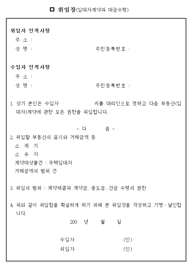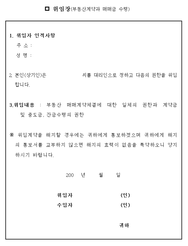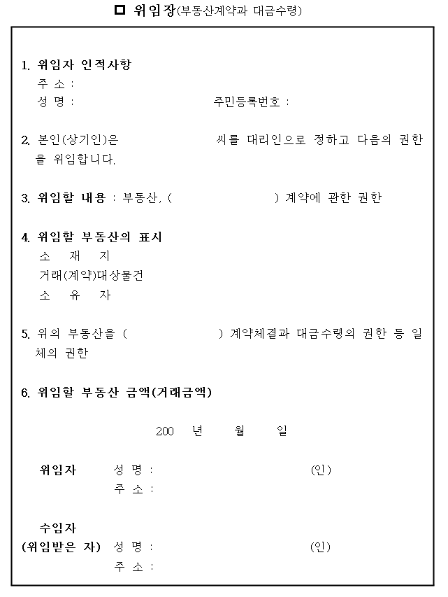 - 특정 부동산에 대한 권한 일정 부분을 위임하는 양식으로, 위임자의 인감도장과 인감증명서 등을 첨부하여 상대방과 합의된 경우에 유효합니다.