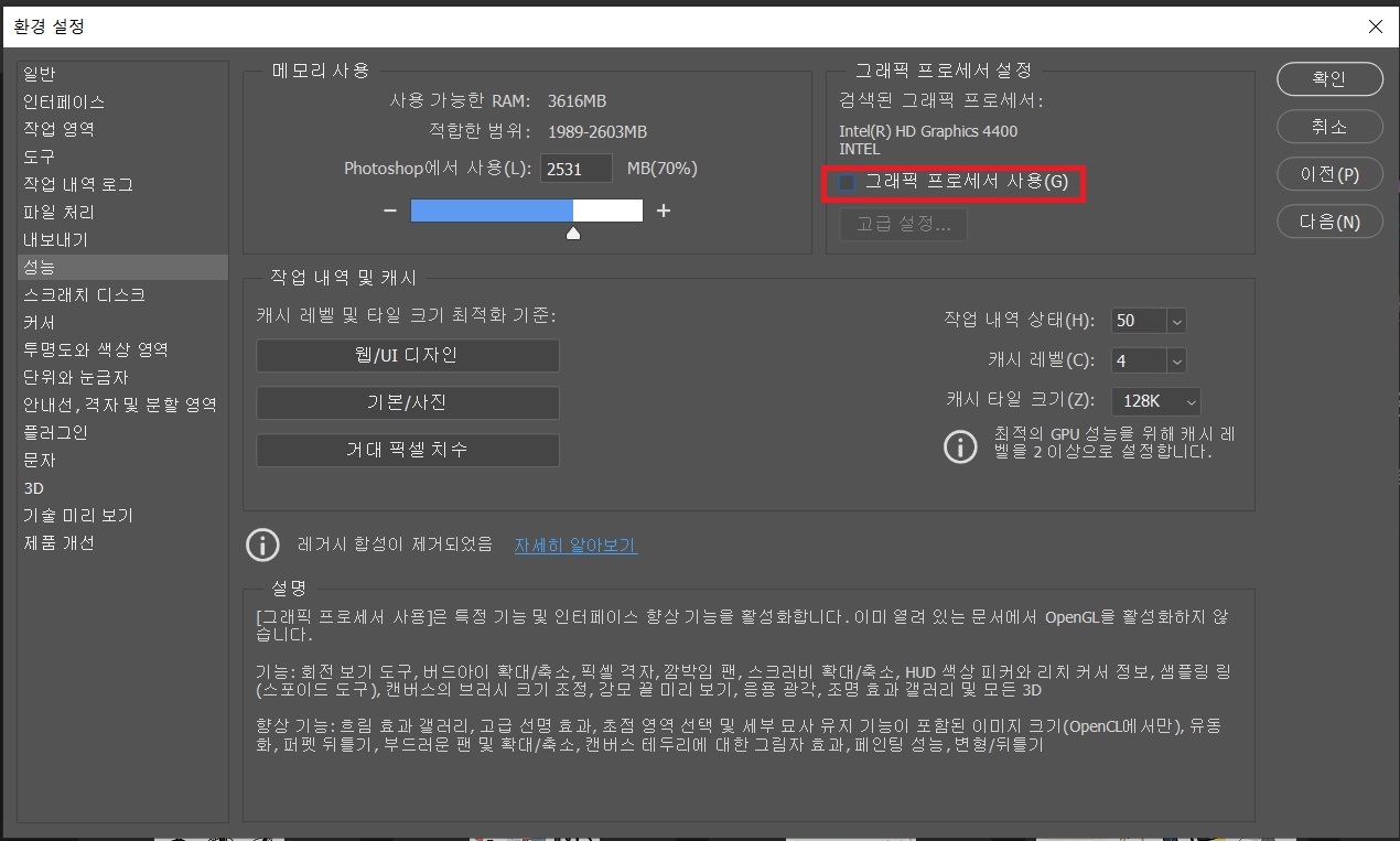 그래픽 프로세서 사용에 체크가 되어 있다면, 해당 체크를 해제합니다.