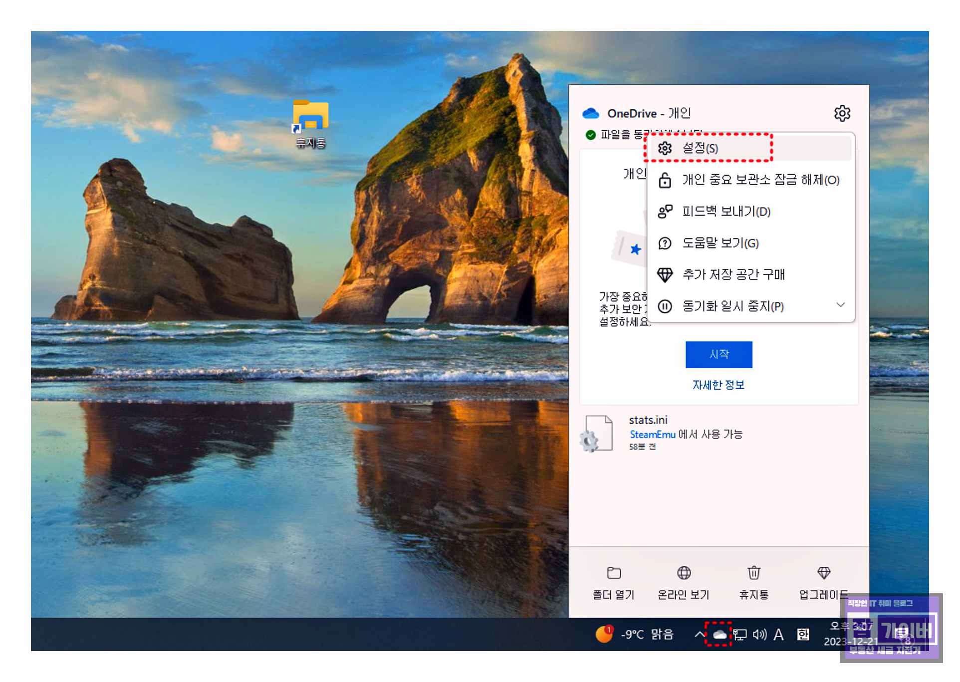 먼저, 작업 표시줄 원드라이브 아이콘을 클릭한 후, 톱니바퀴(도움말 & 설정)를 클릭합니다.