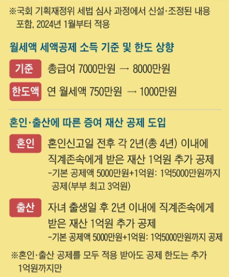 뿐만 아니라, 이번 개정안에는 월세 세액공제 확대도 포함되어 있습니다. 월세 세액공제를 받을 수 있는 소득 기준이 7000만 원에서 8000만 원으로 상향조정되고, 세액공제 한도도 1년에 750만 원에서 1000만 원으로 확대됩니다. 이로써 결혼하거나 아이를 낳는 분들에게는 부가적으로 주거 비용에 대한 경감도 기대할 수 있는 좋은 소식이 돼었습니다.
