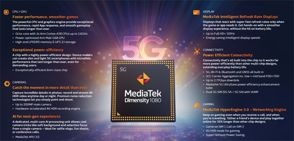 또한, 디멘시티 1080은 인공지능을 위한 인공신경망 프로세서인 MediaTek APU 3.0을 탑재하고 있습니다. 이를 통해 4.5TOPS의 인공지능 성능을 발휘하며, 다양한 AI 응용 프로그램 및 서비스에서 높은 성능을 보여줍니다.