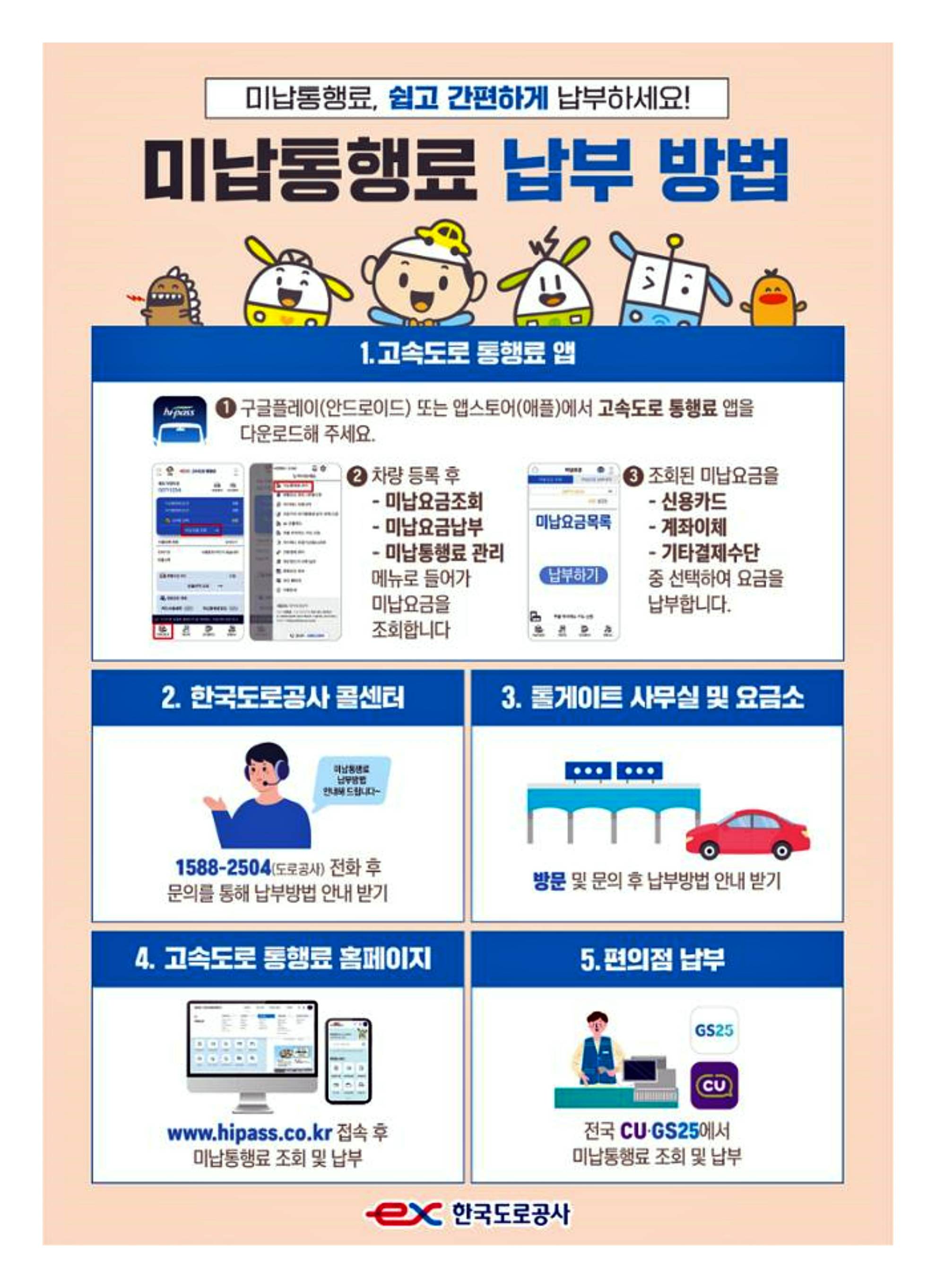 - 도로공사 하이패스 미납요금 조회 사이트 또는 고지서에 기재된 계좌번호로 납부 가능합니다.