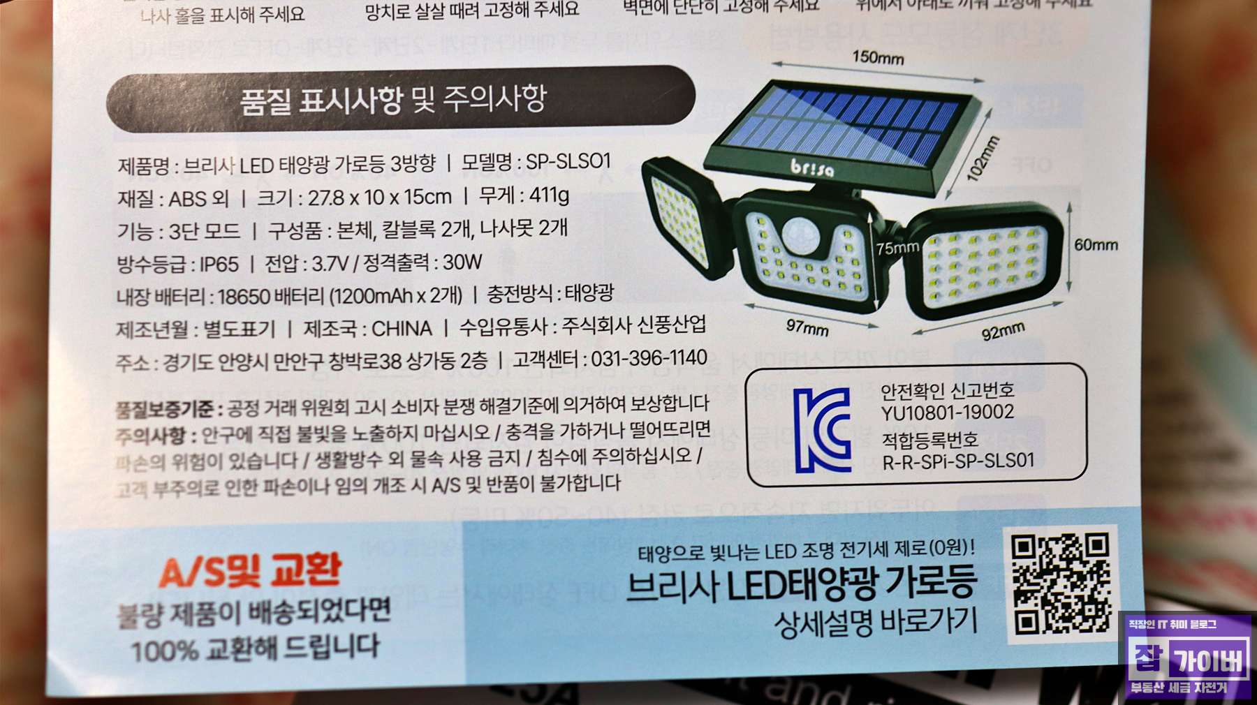 2층 상가주택에 거주하고 있는데 1층의 뒷쪽에 있는 창고 앞이 너무 어두워져서 LED 충전식 센서등을 알리익스프레스에서 찾던 중, 실내용이 아닌 야외에 설치할 수 있는 태양열 조명 LED 센서등을 발견했습니다. 충전과 배터리 교체가 번거로울 것을 고려하여 태양열배터리가 장착된 제품을 찾아보았고, 가격도 1만원대로 생각보다 비싸지 않고 KC인증을 받은 브리사 LED 태양열조명 센서등을 선택했습니다.