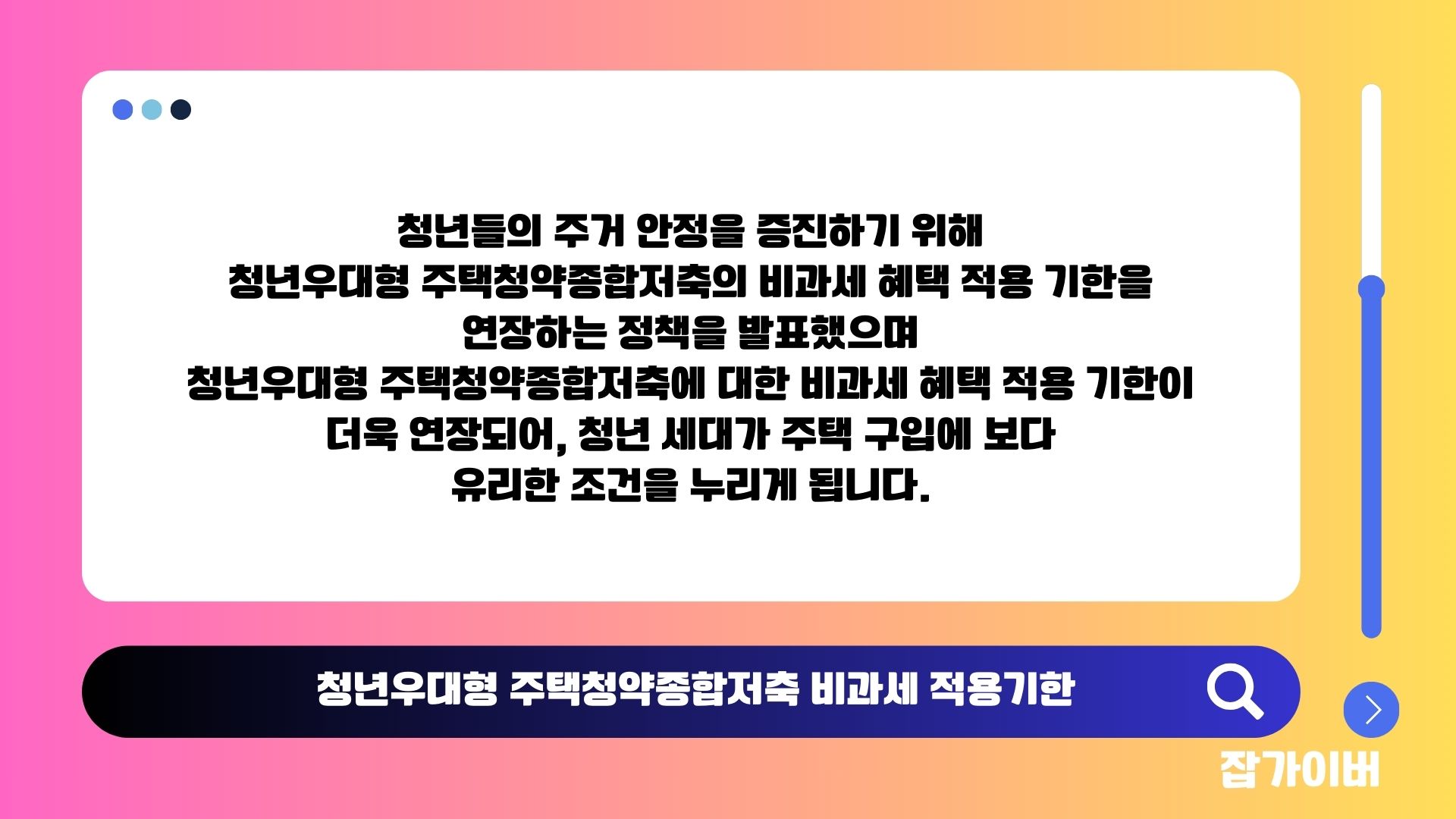 연장된 비과세 적용 기한은 주로 청년 세대에게 부담을 덜어주고 주택 구입의 경제적 부담을 경감시켜 주기 위함입니다.