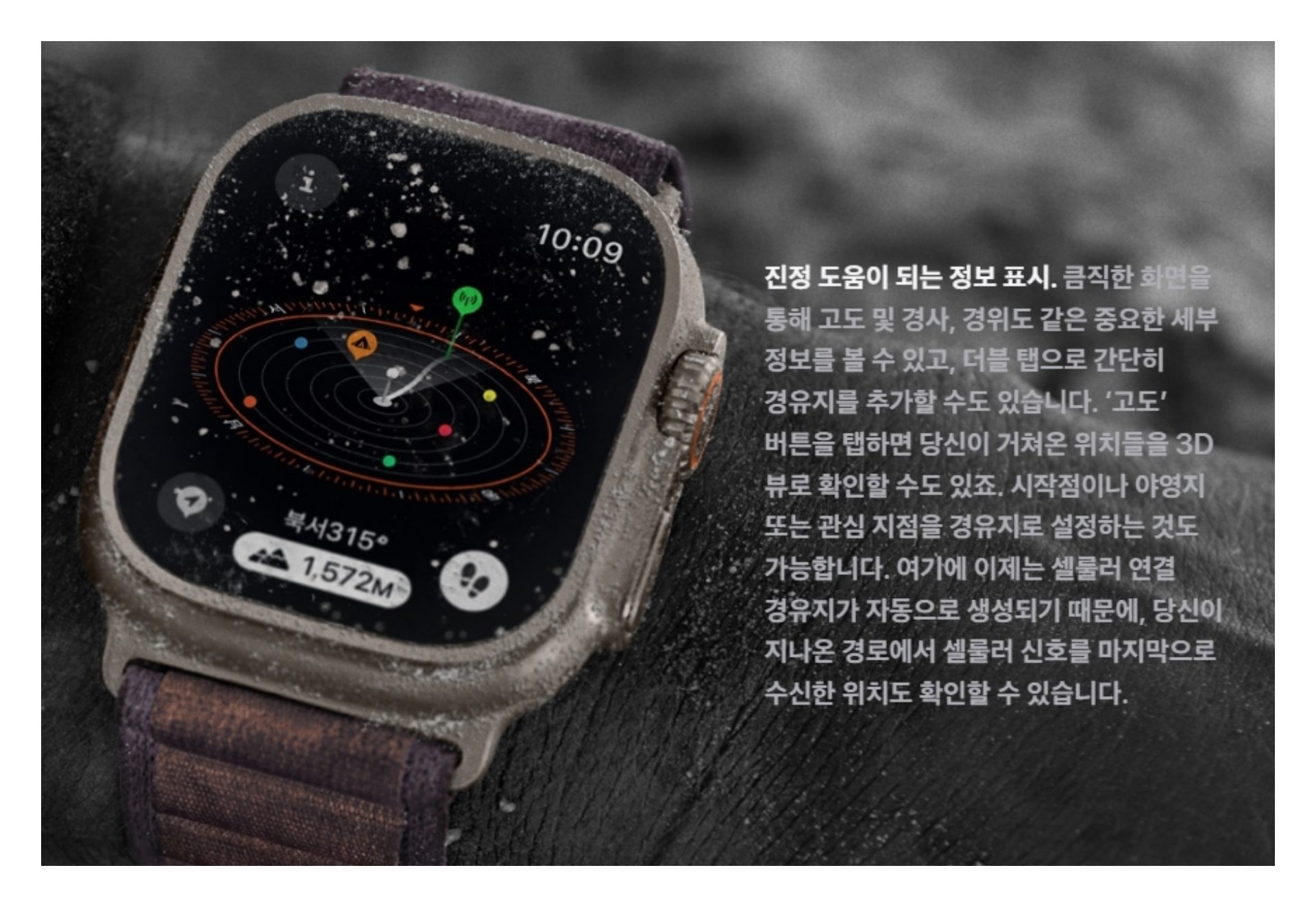 - 95% 재활용 티타늄으로 제작된 케이스는 흠집이나 긁힘에 강하며, 크라운과 측면 버튼을 보호하는 크라운 가드도 추가되었습니다.