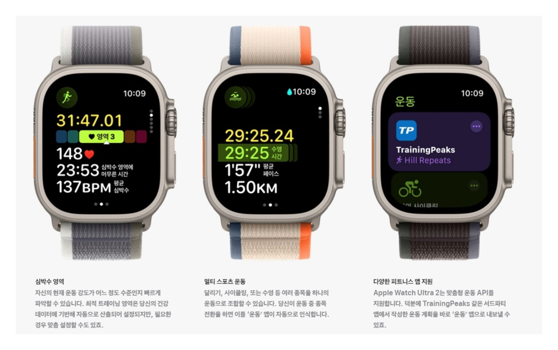 - 건강 및 피트니스 트래킹 기능은 워치 시리즈 9와 동일하게 S9 칩셋을 사용하여 향상되었습니다.