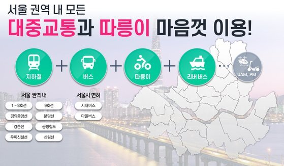 | 서비스 범위 | ① 서울지역 내 지하철<br> ② 서울시 면허 시내·마을버스<br> ③ 따릉이 |