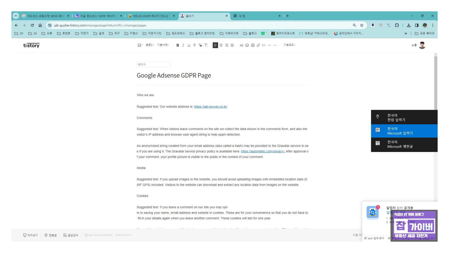 이렇게 생성된 페이지를 구글 애드센스의 유럽규정에 추가합니다.