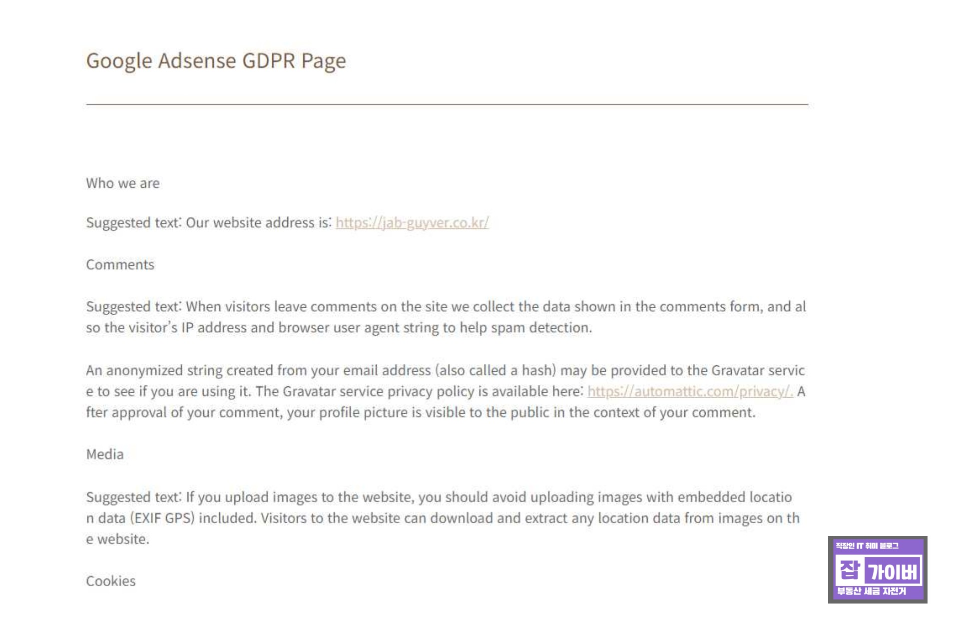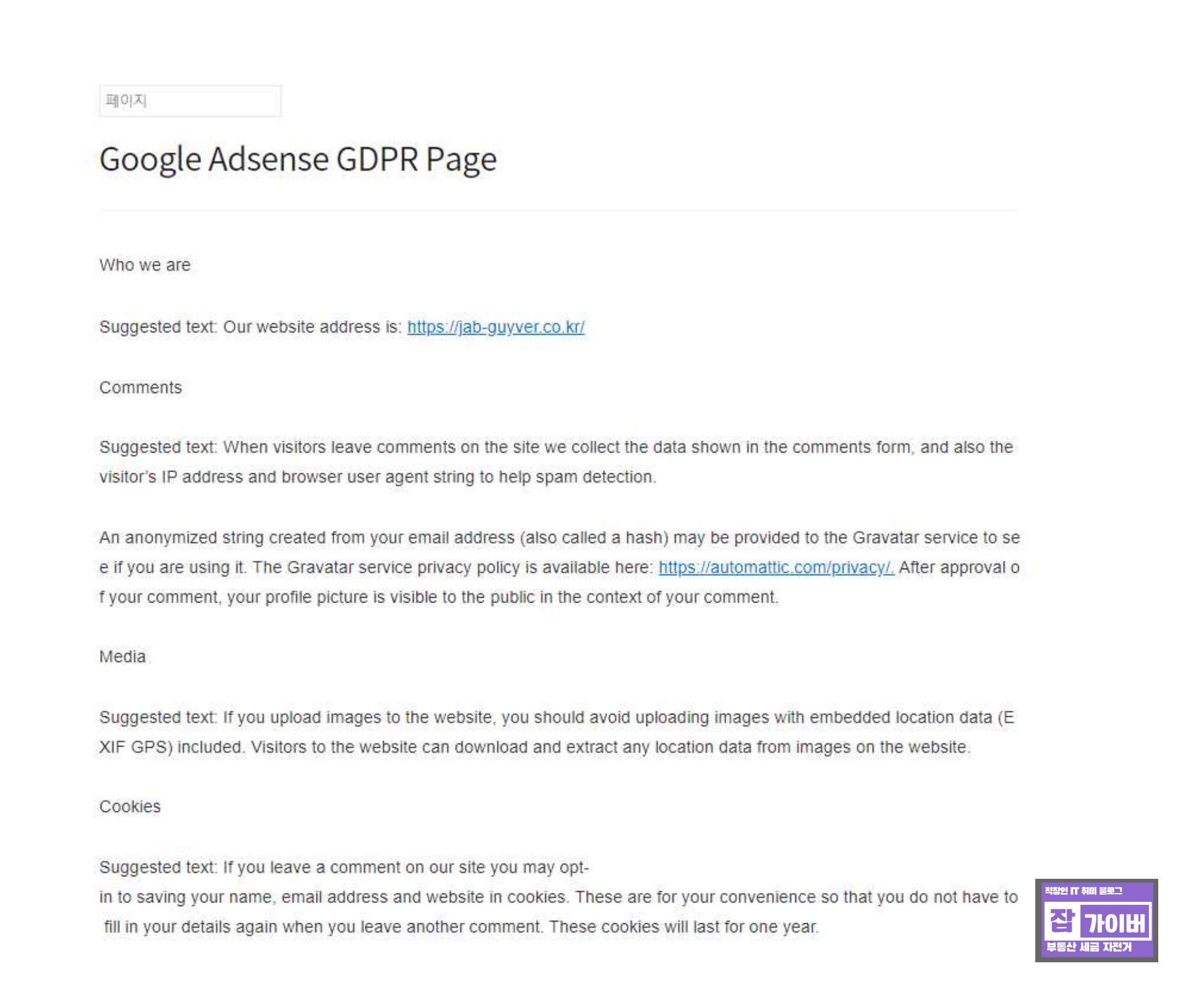 저는 알아보기 쉽게 영어로 Google Adsense GDPR Page를 새롭게 생성 후 아래와 같이 기본적인 개인정보 보호페이지를 생성합니다.