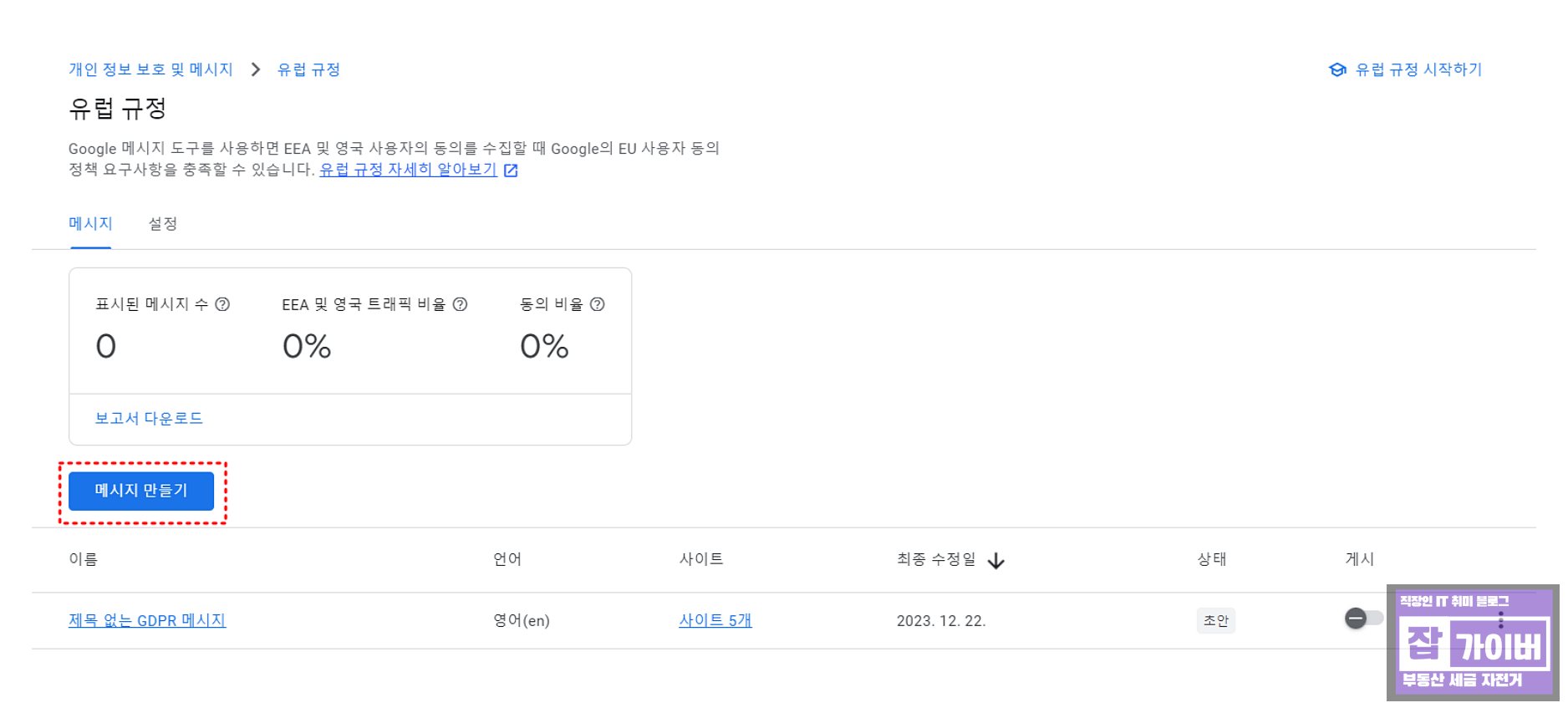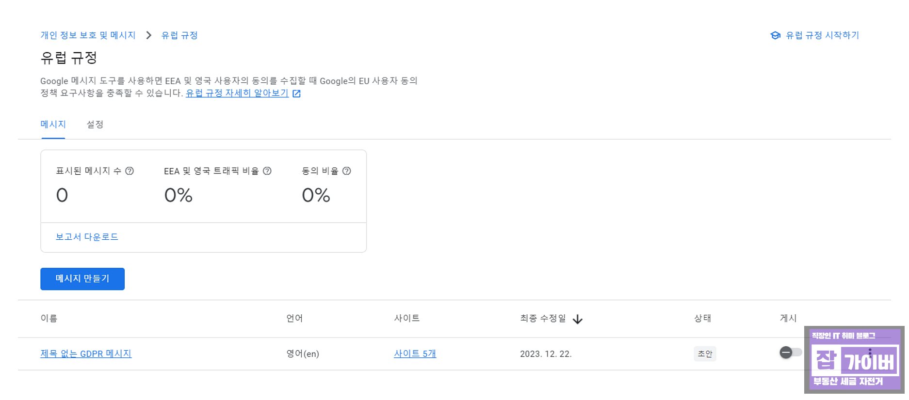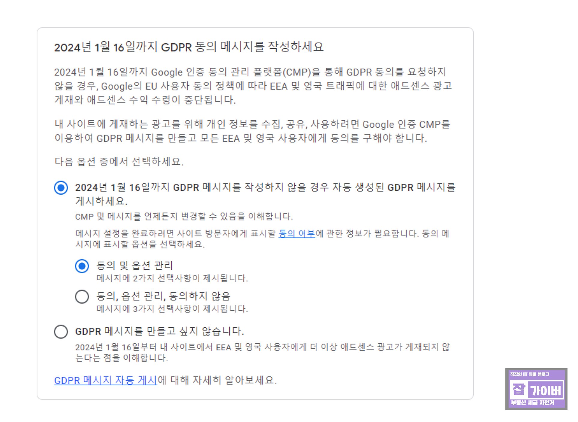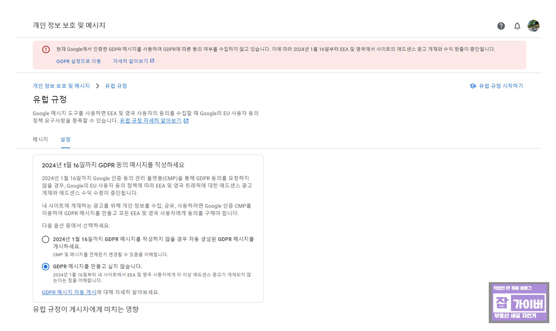구글 애드센스 접속 후 개인정보 보호 및 메시지에서 일반 사용자라면 GPDR 메시지를 만들고 싶지 않습니다 체크하면 편리하게 유럽관련하여 2024년 1월 16일부터 EEA 및 영국 사용자에게 더이상 광고가 개제 되지 않도록 설정할 수 있습니다.