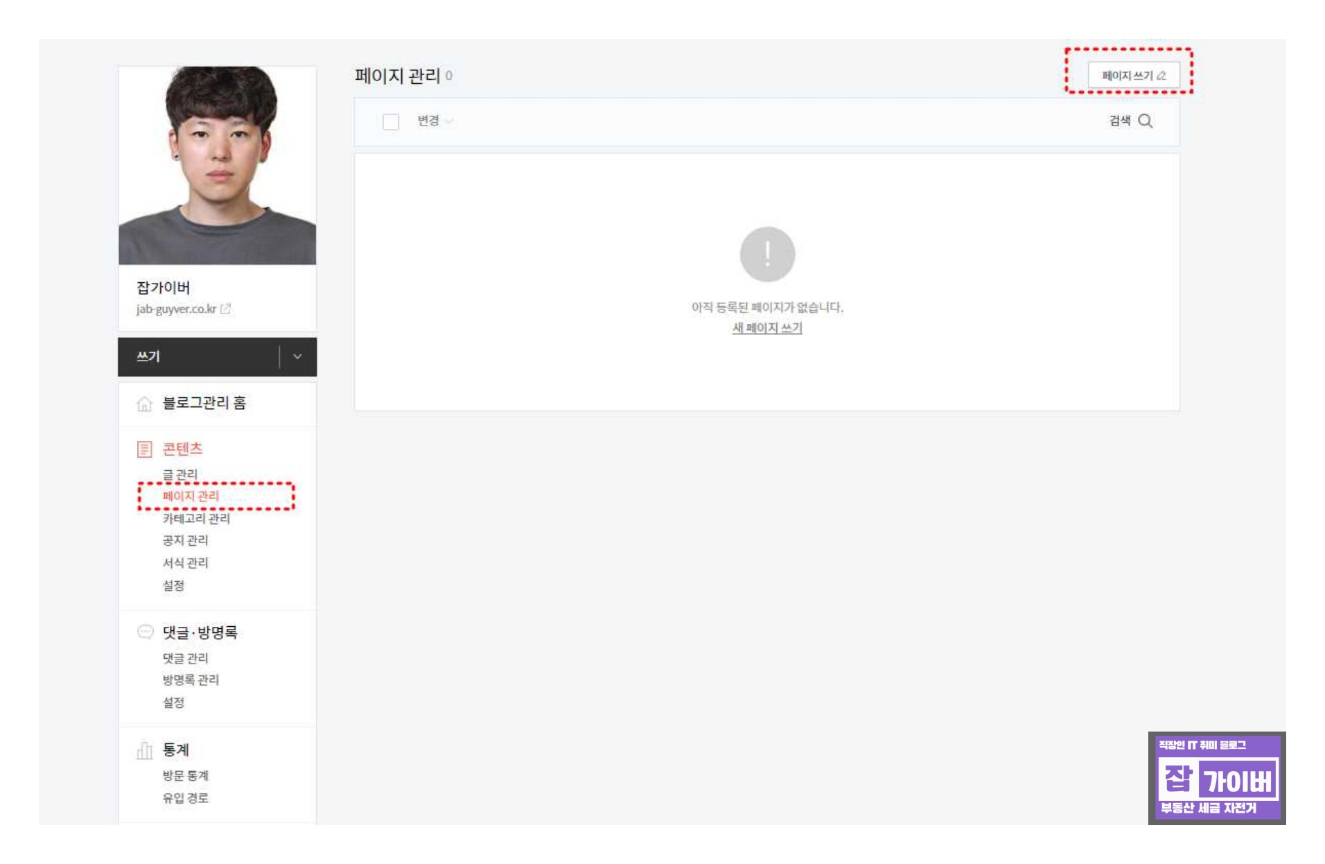 티스토리 관리자로 접속 후 페이지 관리에서 페이지 쓰기로 새롭게 페이지를 생성합니다.