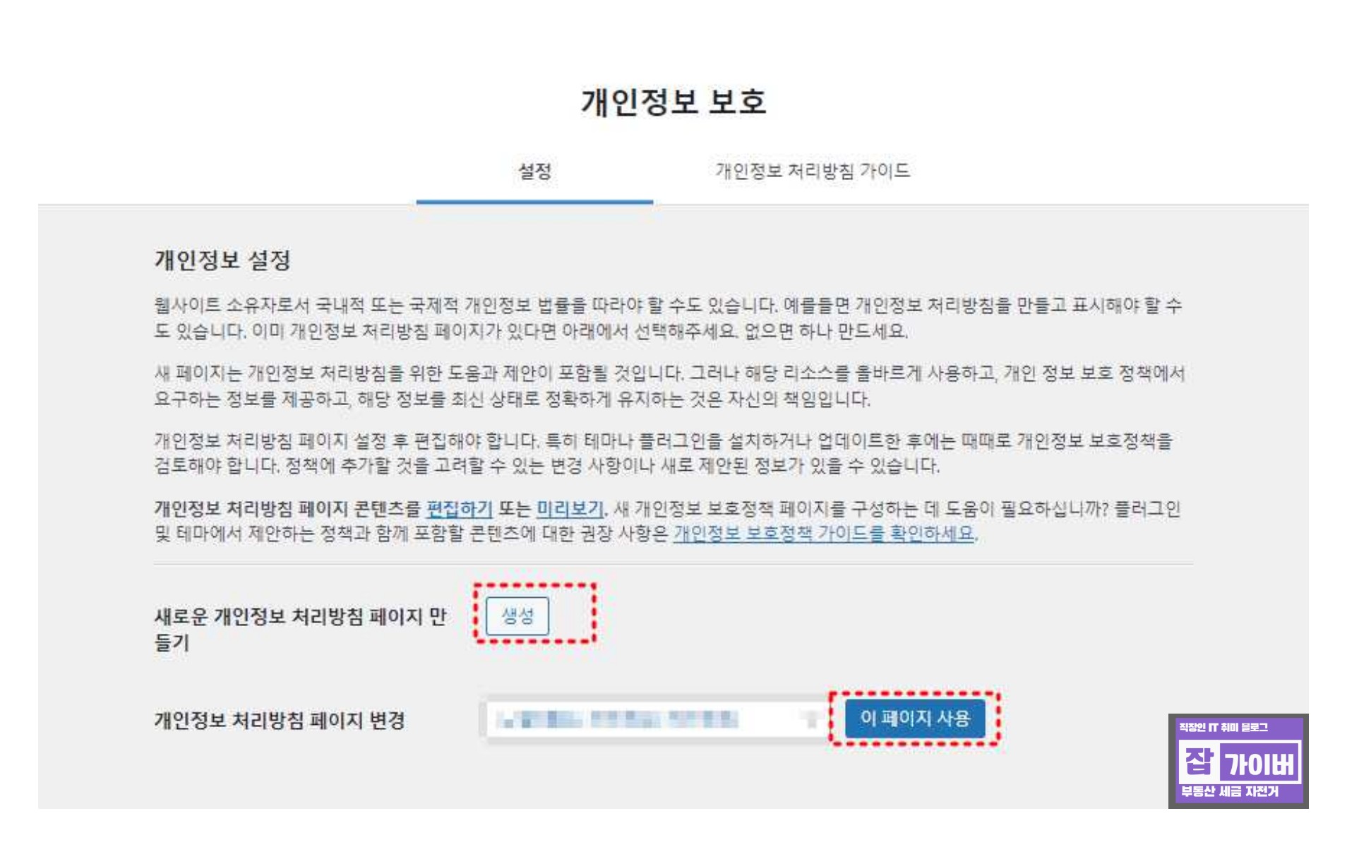 새로운 개인정보 처리방지 페이지를 자동으로 생성 후 설정하면 간편합니다.