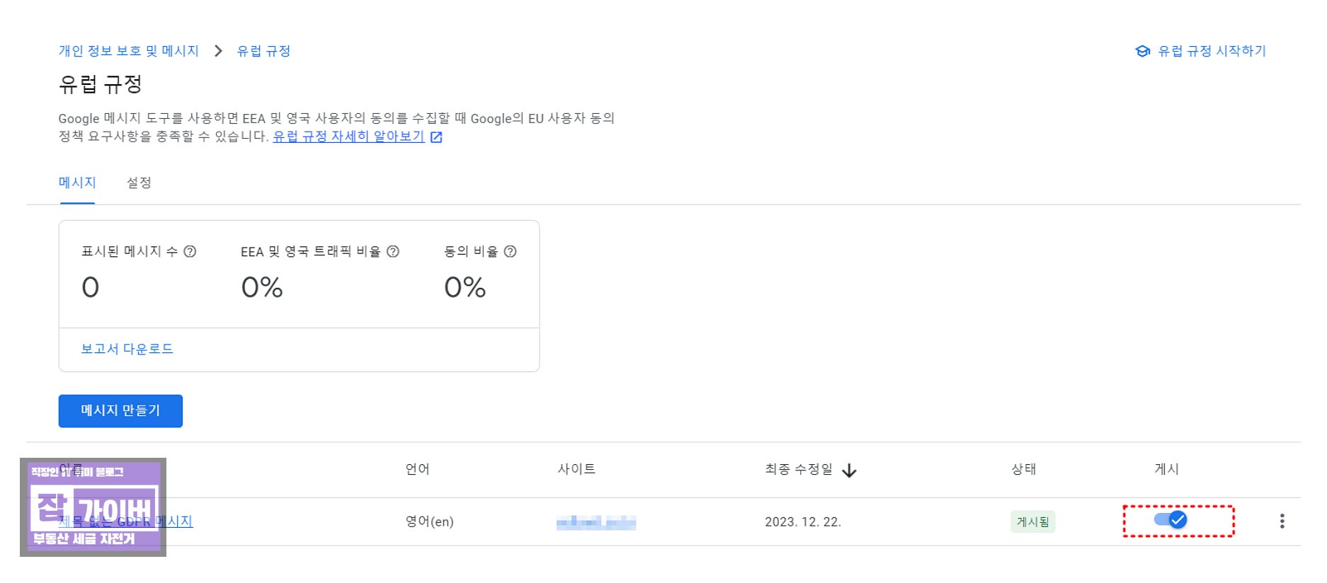 모든 설정이 완료되엇따면 게시를 활성화화면 티스토리나 워드프레스 등 유럽규정 알림이 활성화되어 Google의 EU사용자 동의정책요구사항에 대하여 충족됩니다.