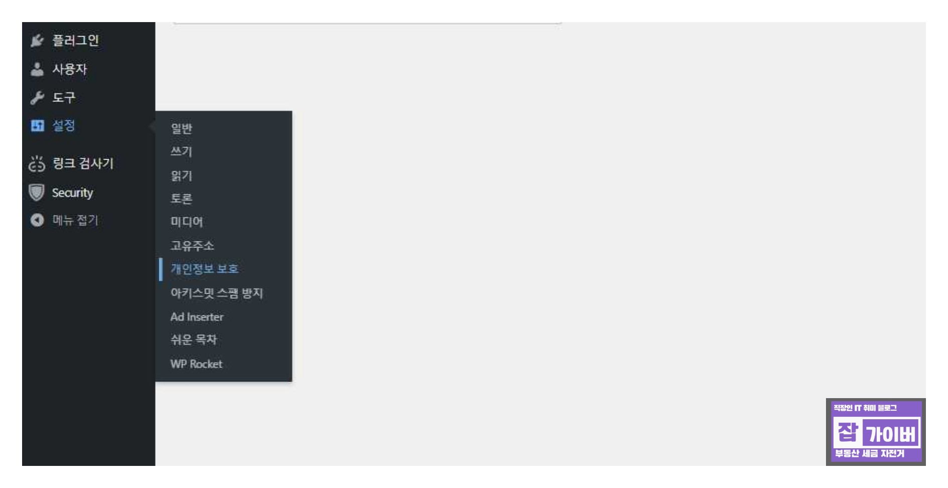워드프레스 사용자라면 별도의 페이지를 만들 필요 없이 설정 -> 개인정보 보호를 선택합니다.