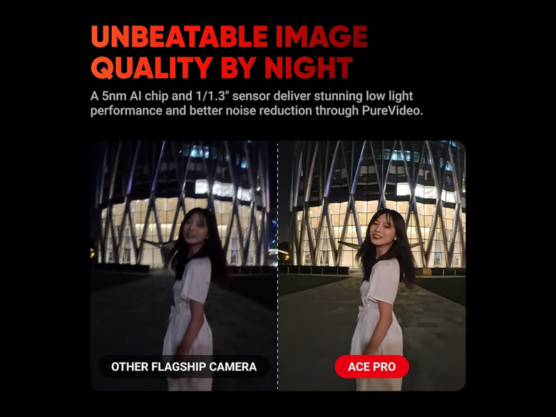 에이스 프로는 플래그십 1/1.3" 센서와 5nm AI 칩을 특징으로 하는 최신 액션 카메라입니다.