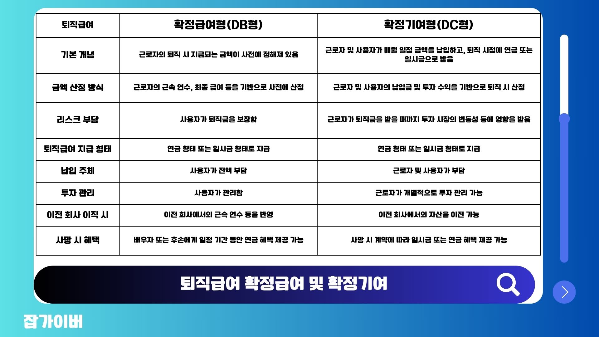 | 퇴직급여 | 특징확정급여형(DB형) | 확정기여형(DC형) |