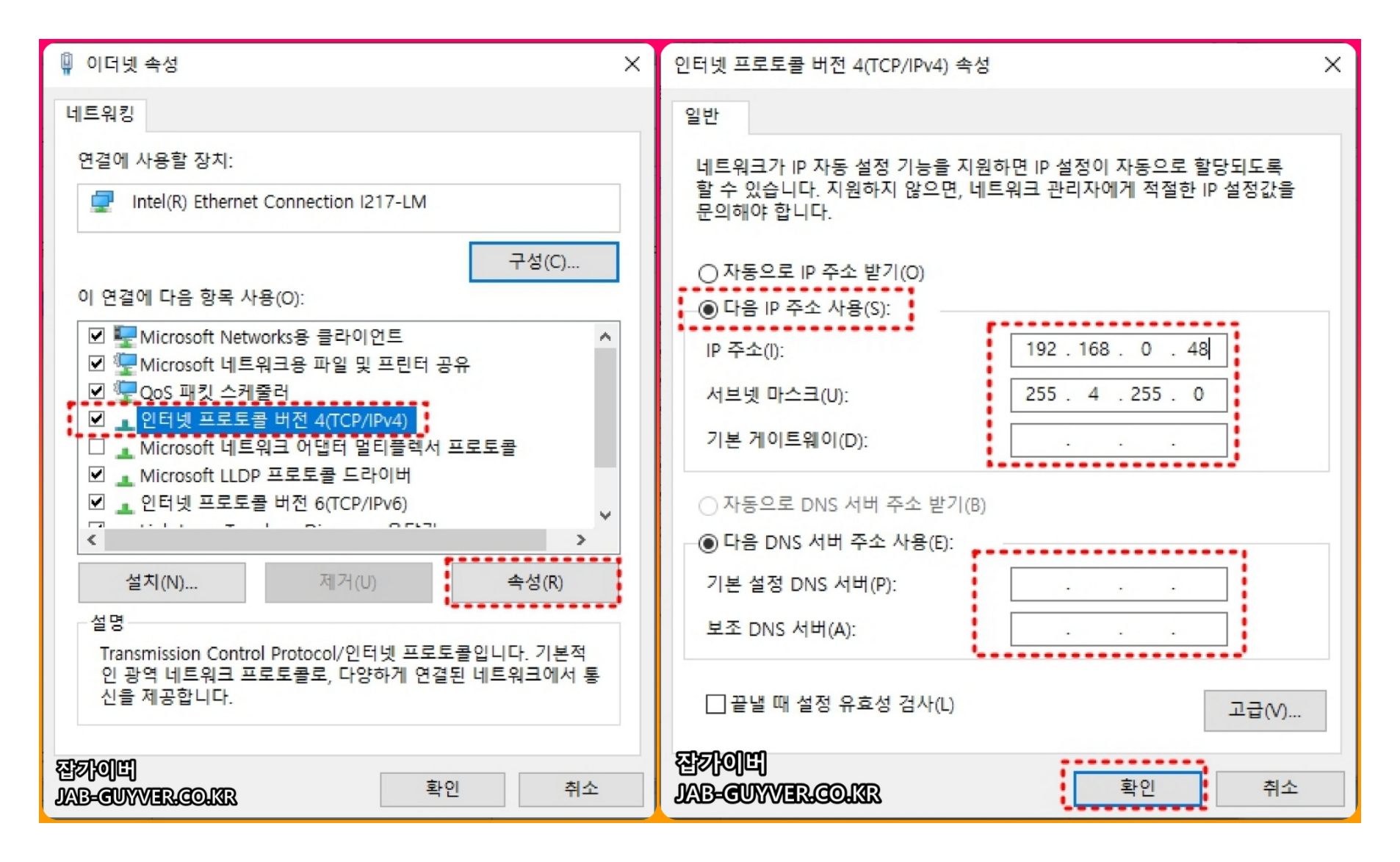 컴퓨터 인터넷 IP주소 수동 IPv4 IPv6 DNS 변경 - 윈도우10