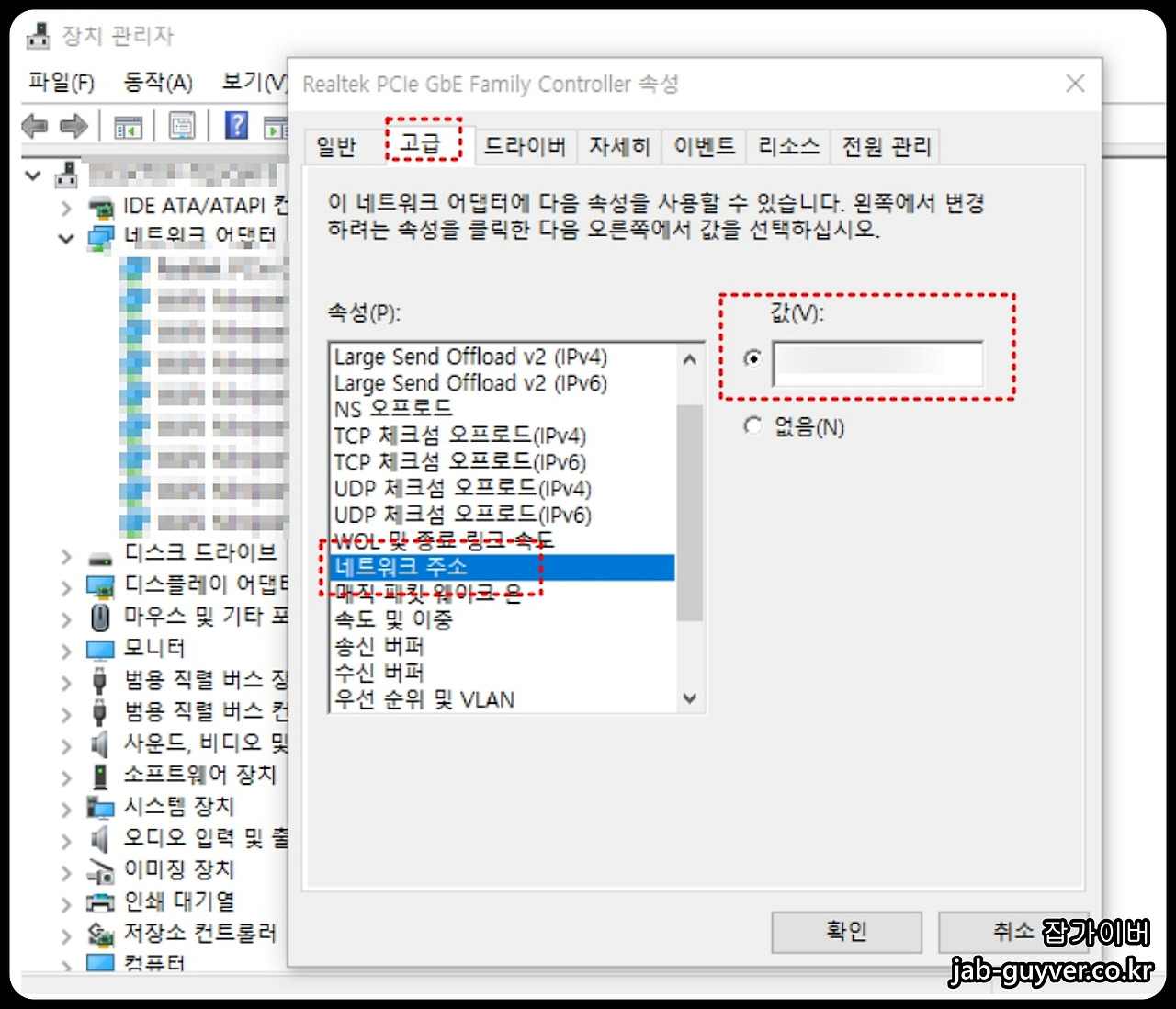 네트워크 주소 항목을 선택하고, 기존 값을 삭제한 후 새로운 임의의 값을 입력합니다. (예: 12-34-56-78-9A-BC)