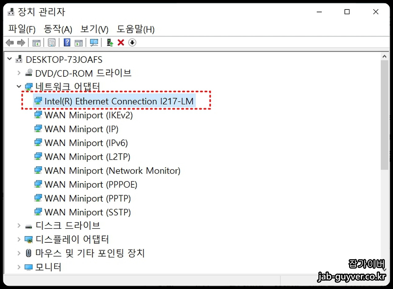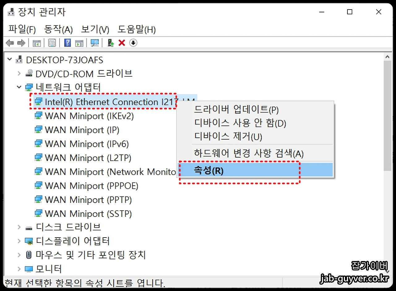 네트워크 어댑터 속성 변경을 위해 장치 관리자에서 네트워크 어댑터를 선택 후 현재 사용 중인 랜카드를 우클릭하고 속성을 선택한 후 고급 탭으로 이동합니다.