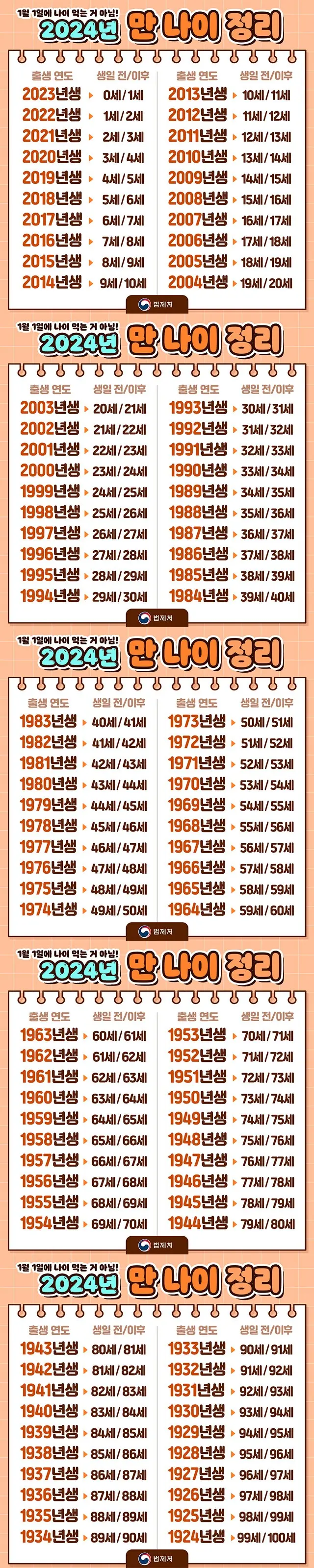 2024년에 대한 변경 사항에 따르면, 한국에서는 '만 나이'로의 통일이 예정되어 있습니다. 현재는 '만 나이', '연 나이', 그리고 '한국식 나이'로 세 가지 계산법이 혼용되어 있어 사회적 혼란을 초래하고 있습니다. 이에 따라 대통령직 인수위원회는 윤석열 대통령 당선인의 공약에 따라 사회적 나이 계산법을 '만 나이'로 통일하는 방향으로 추진할 예정입니다.