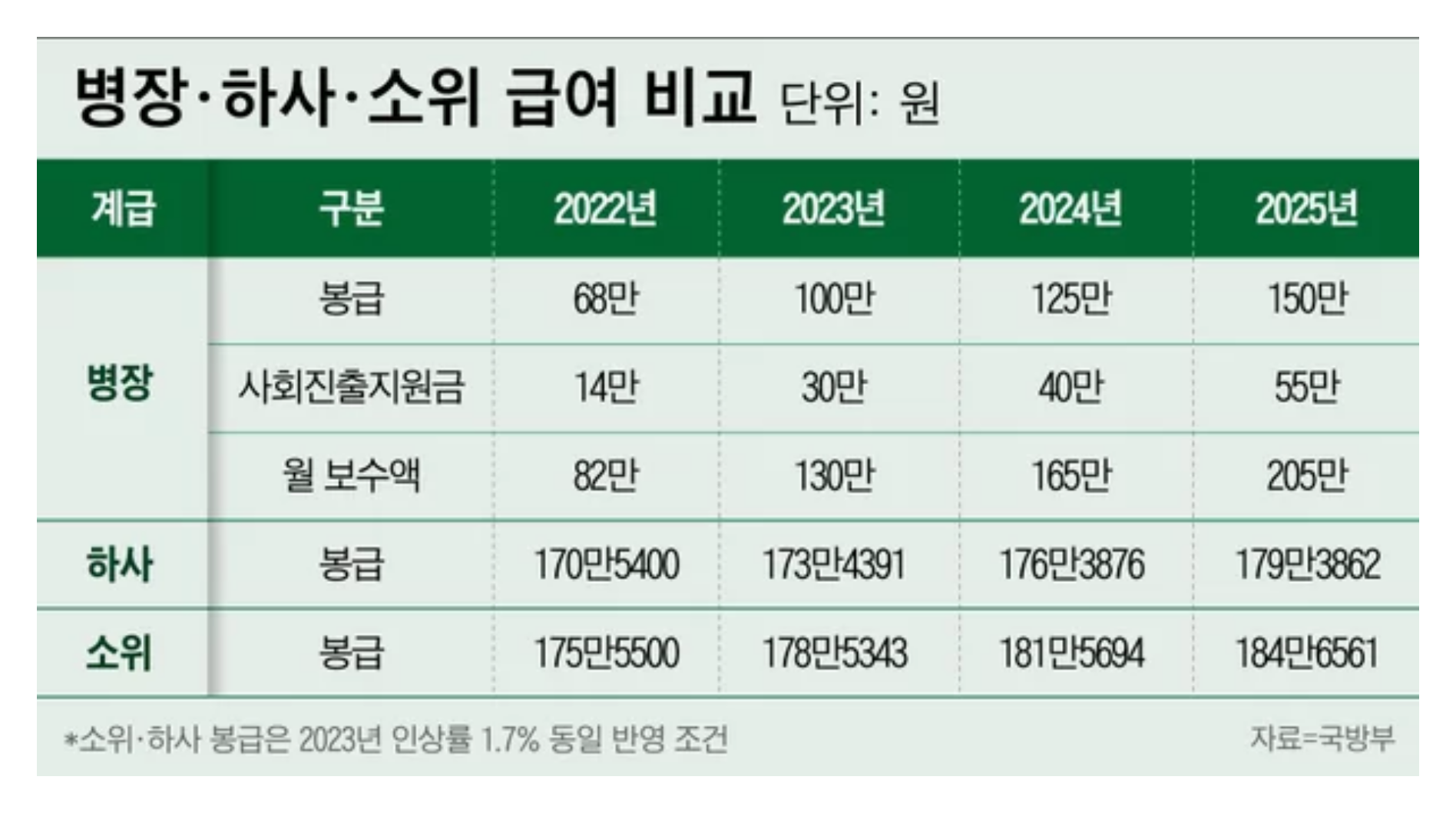 군인 사병 봉급은 2022년에는 67.6만원이었지만, 2025년까지 단계적으로 인상되어 150만원까지 증가할 예정입니다. 내일준비지원금도 함께 증가하여 2025년에는 55만원까지 도달할 것입니다.