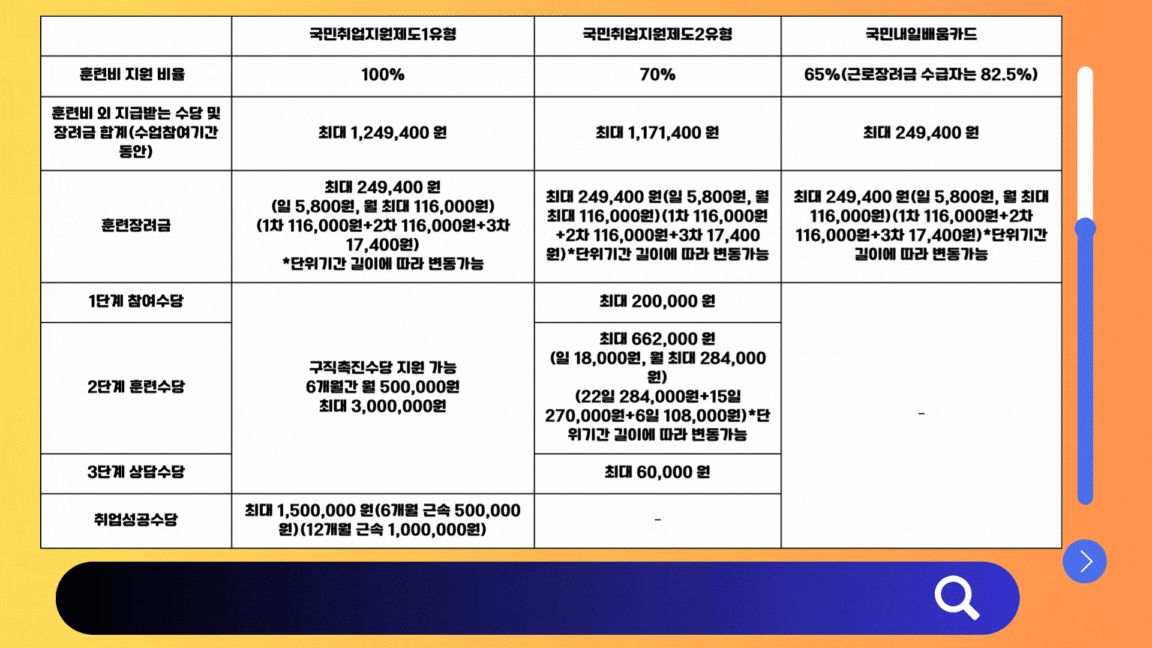 | 국민취업지원제도1유형 | 국민취업지원제도2유형 | 국민내일배움카드 | |
