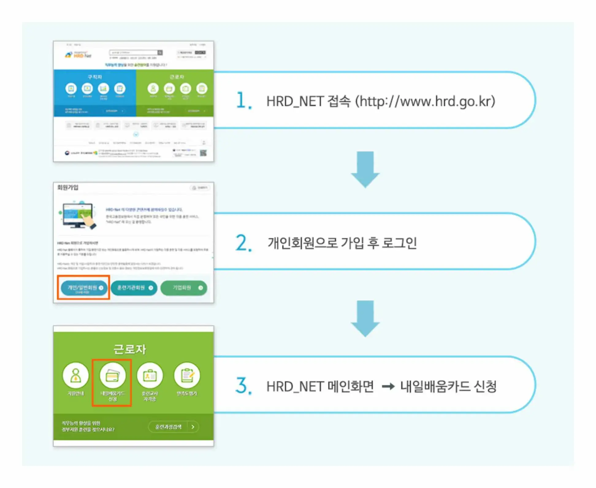 국민내일배움카드 발급 및 신청은 HRD-Net(인적자원개발네트워크) 사이트를 통해 이루어집니다.