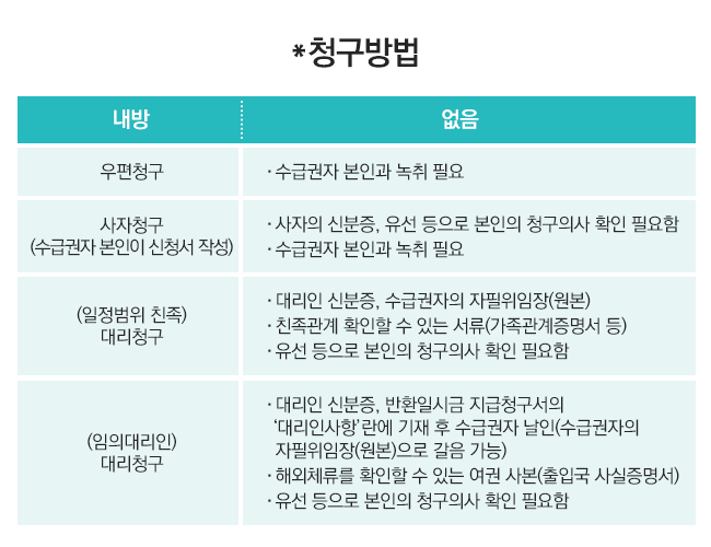 • 본인명의 은행통장 (계좌번호를 알려주면 완료) 도장 ( 서명으로 대체가능)