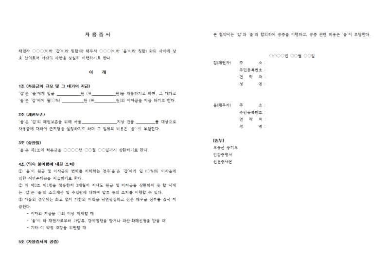 | 채권자, 채무자 정보 | 상호 서명과 날인이 필요하며, 주민등록번호 추가 기재 권장 | 상호 서명과 날인이 필요하며, 주민등록번호 추가 기재 권장 |