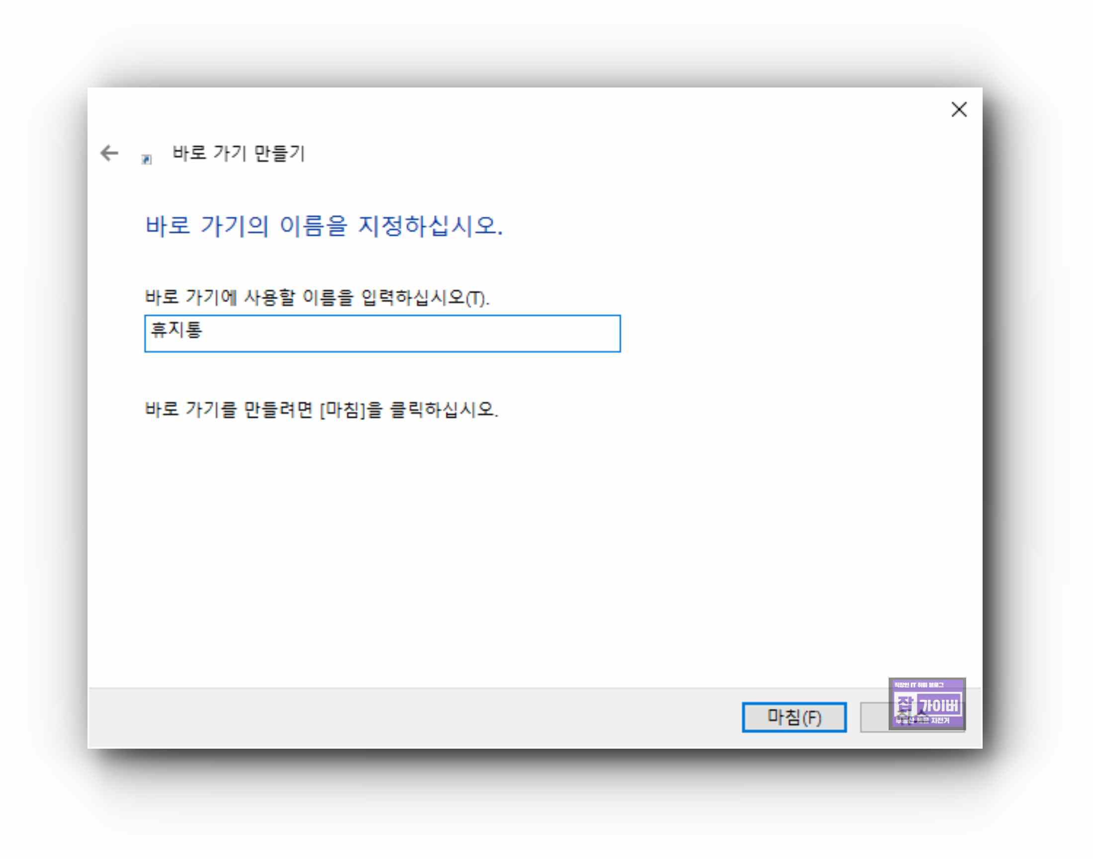 다음 바로가기 이름을 알기 쉽게 휴지통 등으로 지정한 다음 마침을 눌러주면 사라진 바탕화면 휴지통 아이콘이 바로가기로 만들어집니다.
