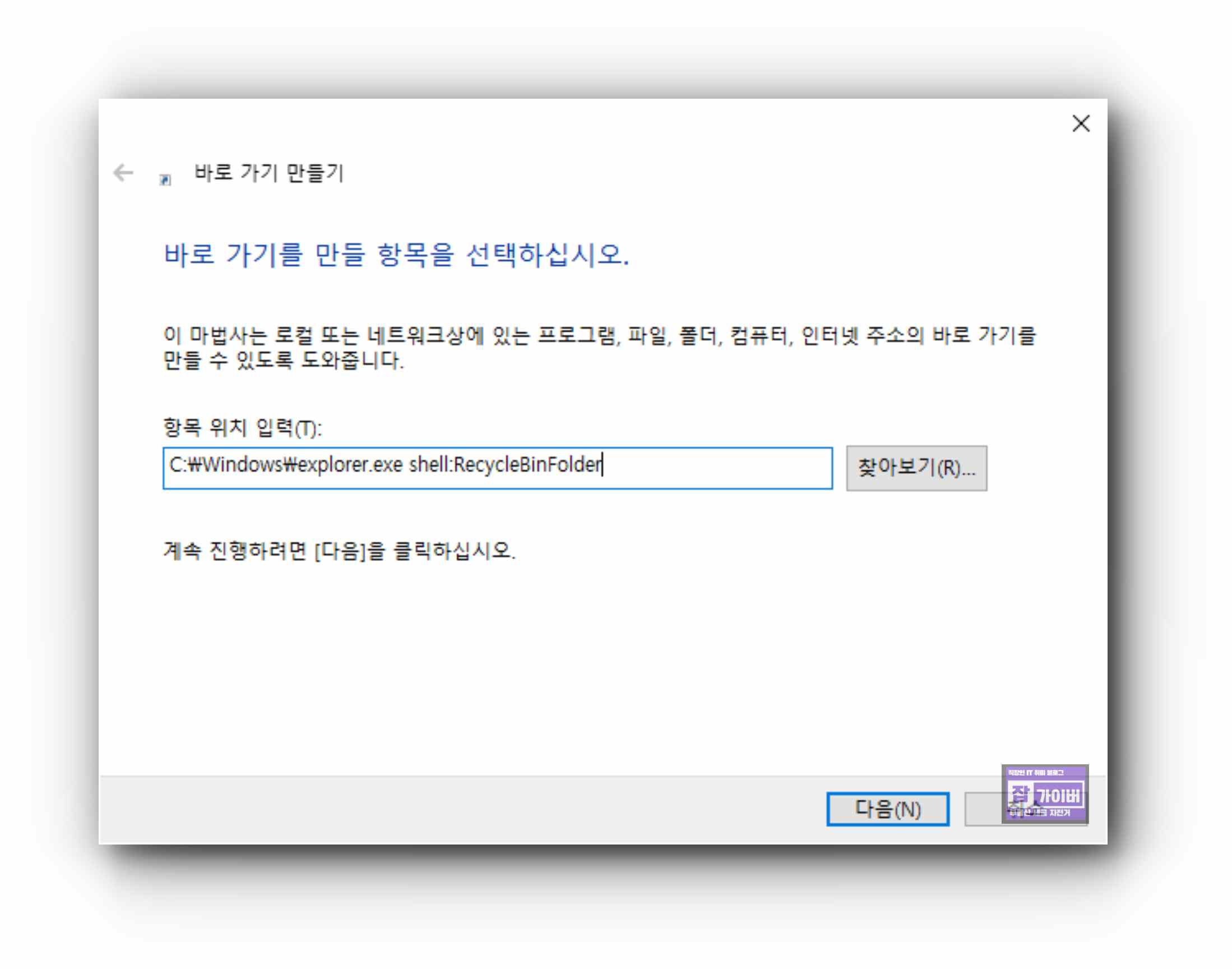 그럼 휴지통바로가기 경로를 생성할 수 있는데 항목 위치 입력을 아래 위치값을 입력합니다.