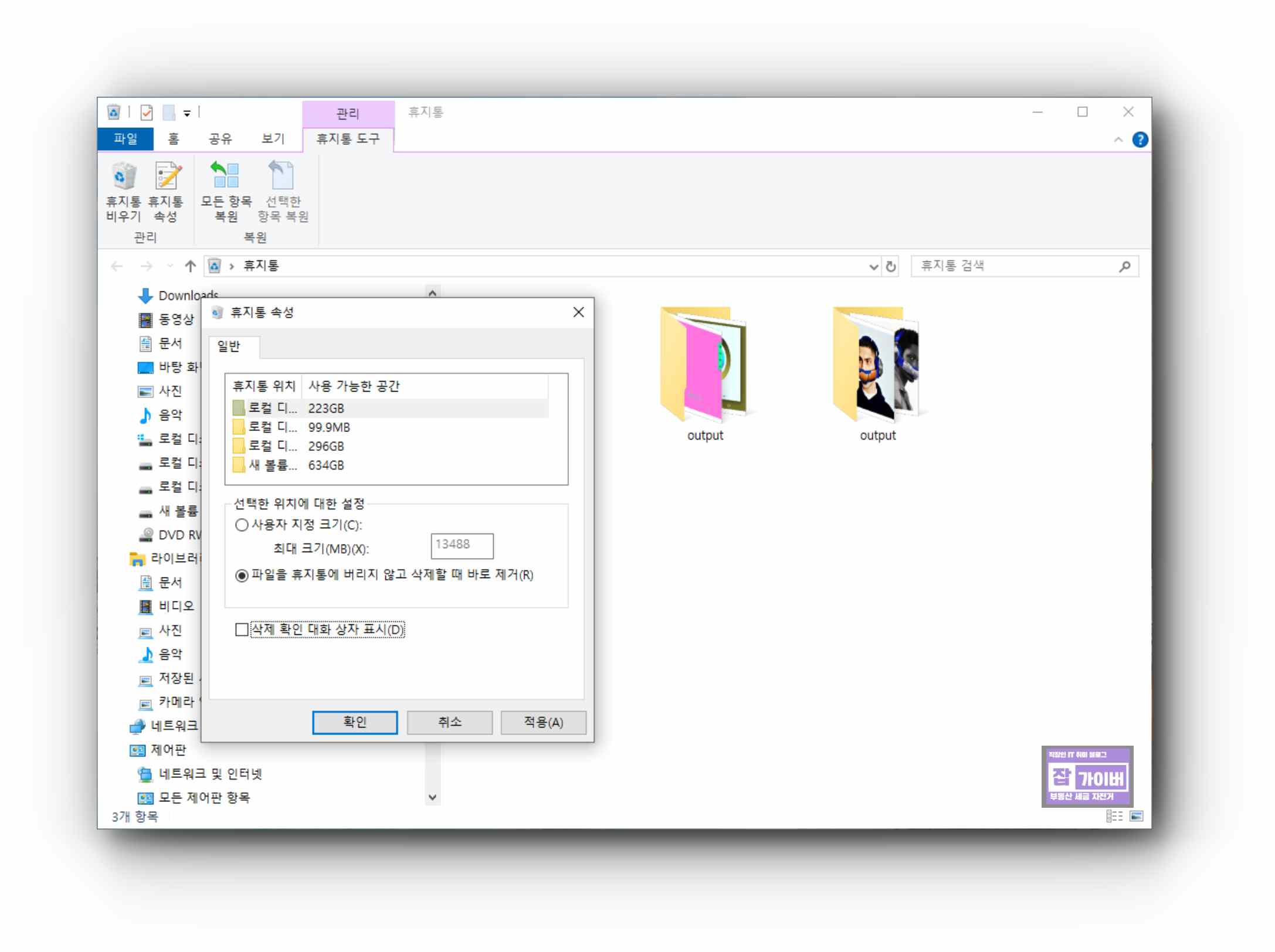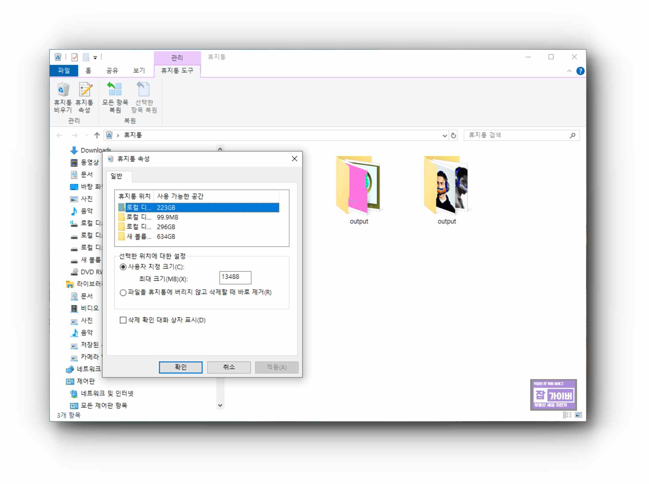간혹 휴지통 비우기를 안하고 계속 두면 c드라이브 용량이 부족해지기 쉽기 때문에 자주 휴지통 비우기를 해주거나 휴지통 용량을 설정해주느것이 좋습니다.