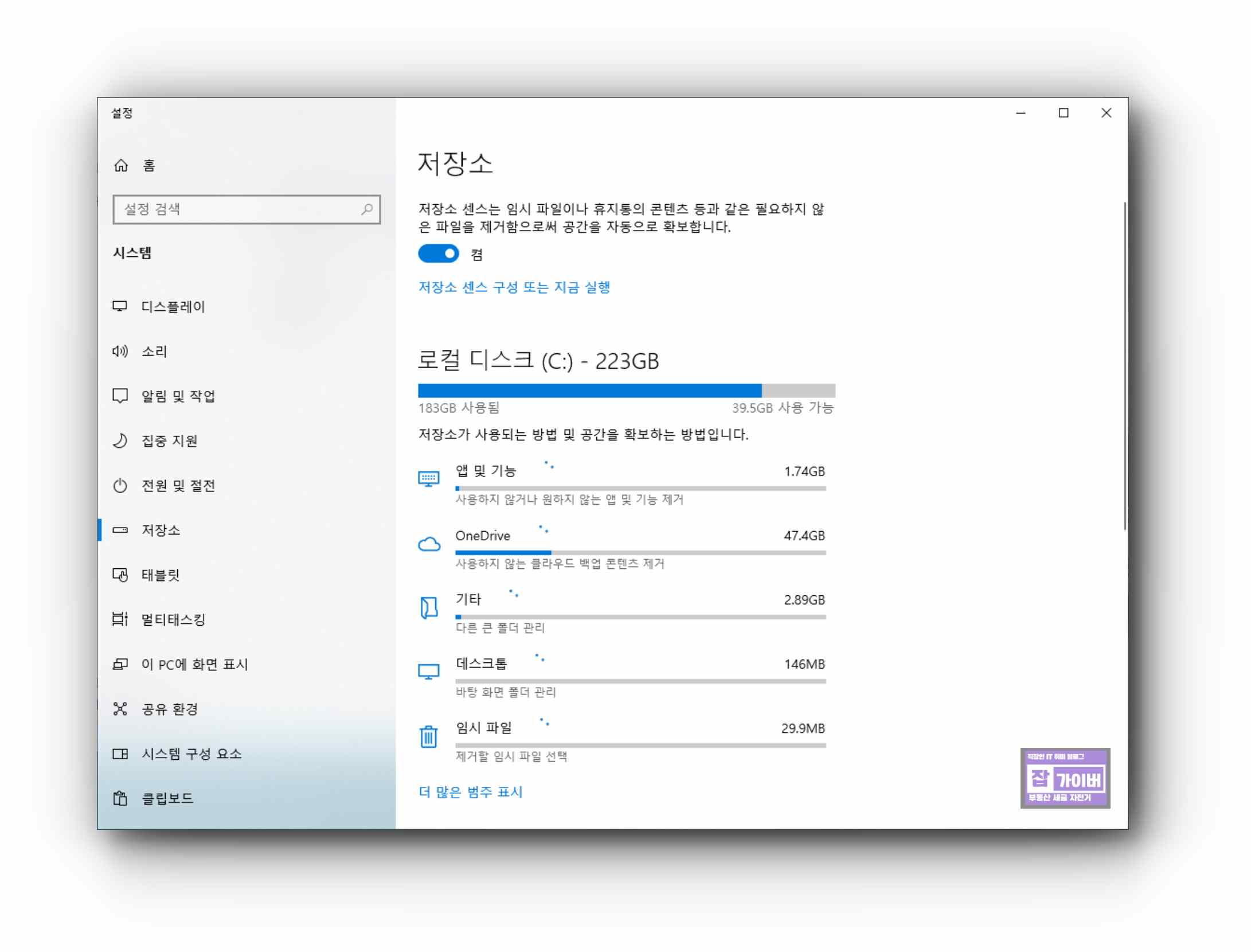 추가로 저장소 센스를 활용하여 C드라이브의 휴지통 및 임시파일, OneDrive 등의 용량을 확인하고 최적화하여 용량을 늘려주느것도 좋습니다.