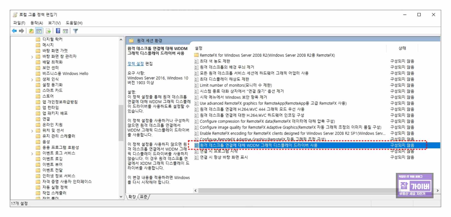 추가로 원격 데스트톱에 연결에 대해 WDDM 그래픽 디스플레이 드라이버는 사용안함으로 체크하고 확인을 누르고 컴퓨터를 재부팅합니다.