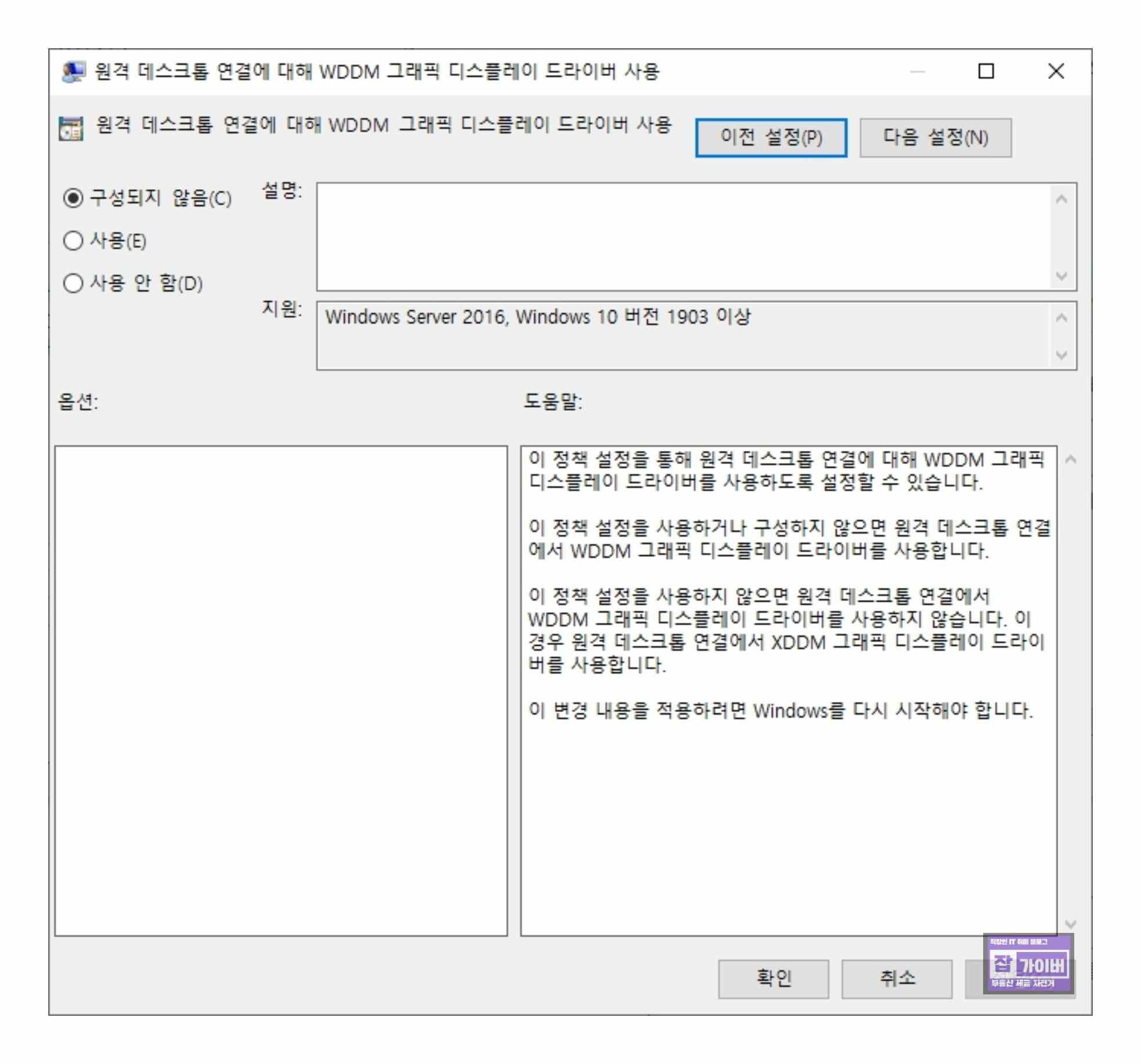 추가로 원격 데스트톱에 연결에 대해 WDDM 그래픽 디스플레이 드라이버는 사용안함으로 체크하고 확인을 누르고 컴퓨터를 재부팅합니다.