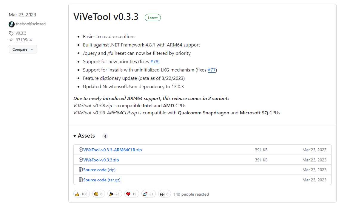 - 먼저 깃허브 홈페이지를 접속해서 ViveTool을 다운로드하고 해당 ZIP 파일을 폴더에 추출합니다.