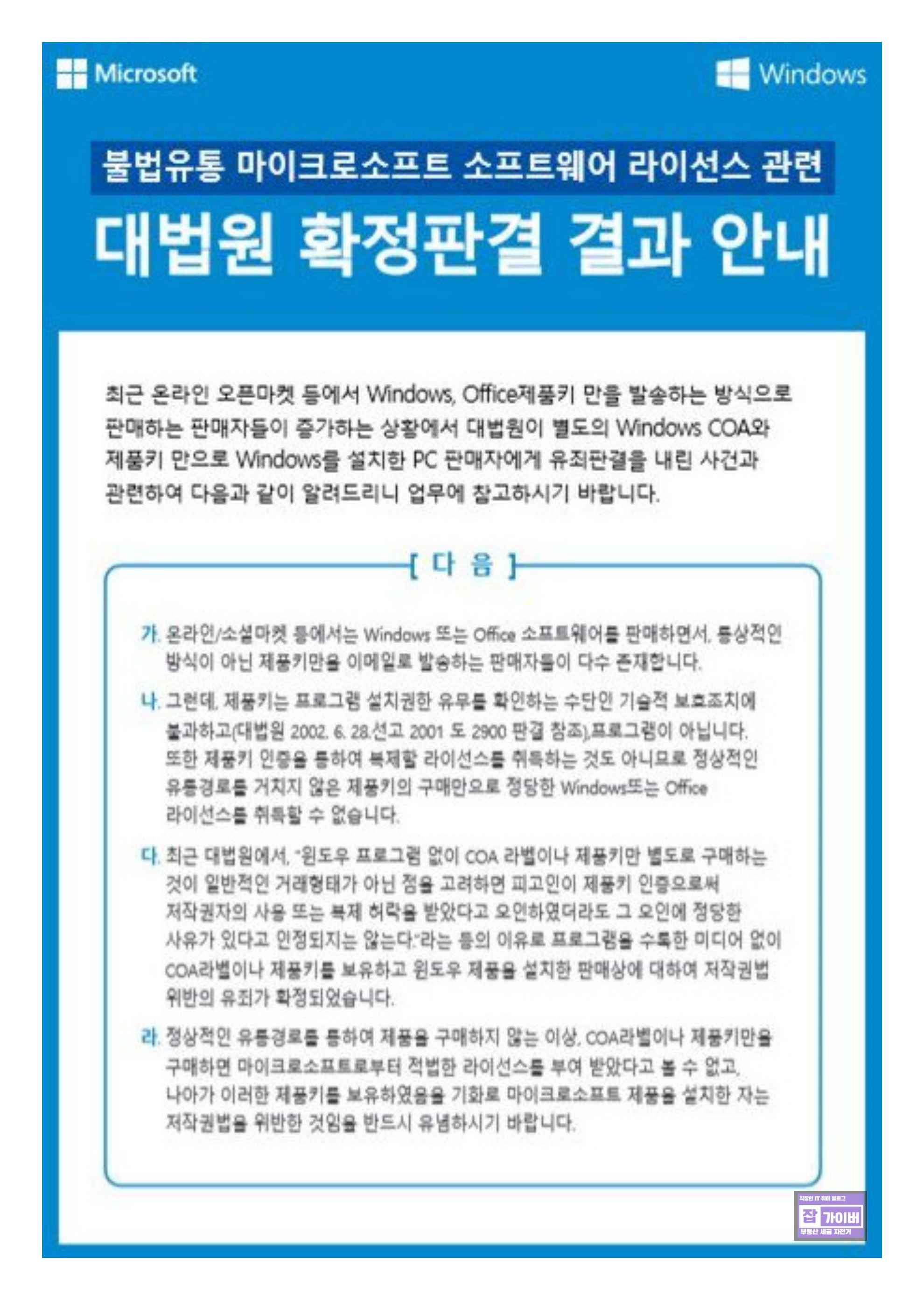 보통 마이크로소프트(Microsoft)는 법무법인을 통해 내용증명을 발송하는 방식으로 단속을 시작합니다.