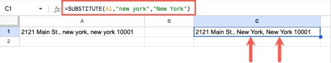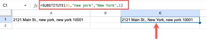 =SUBSTITUTE(A1,”new yor”,”New York”,1)