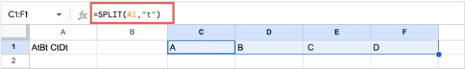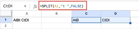 = SPLIT (A1,”t “,FALSE)